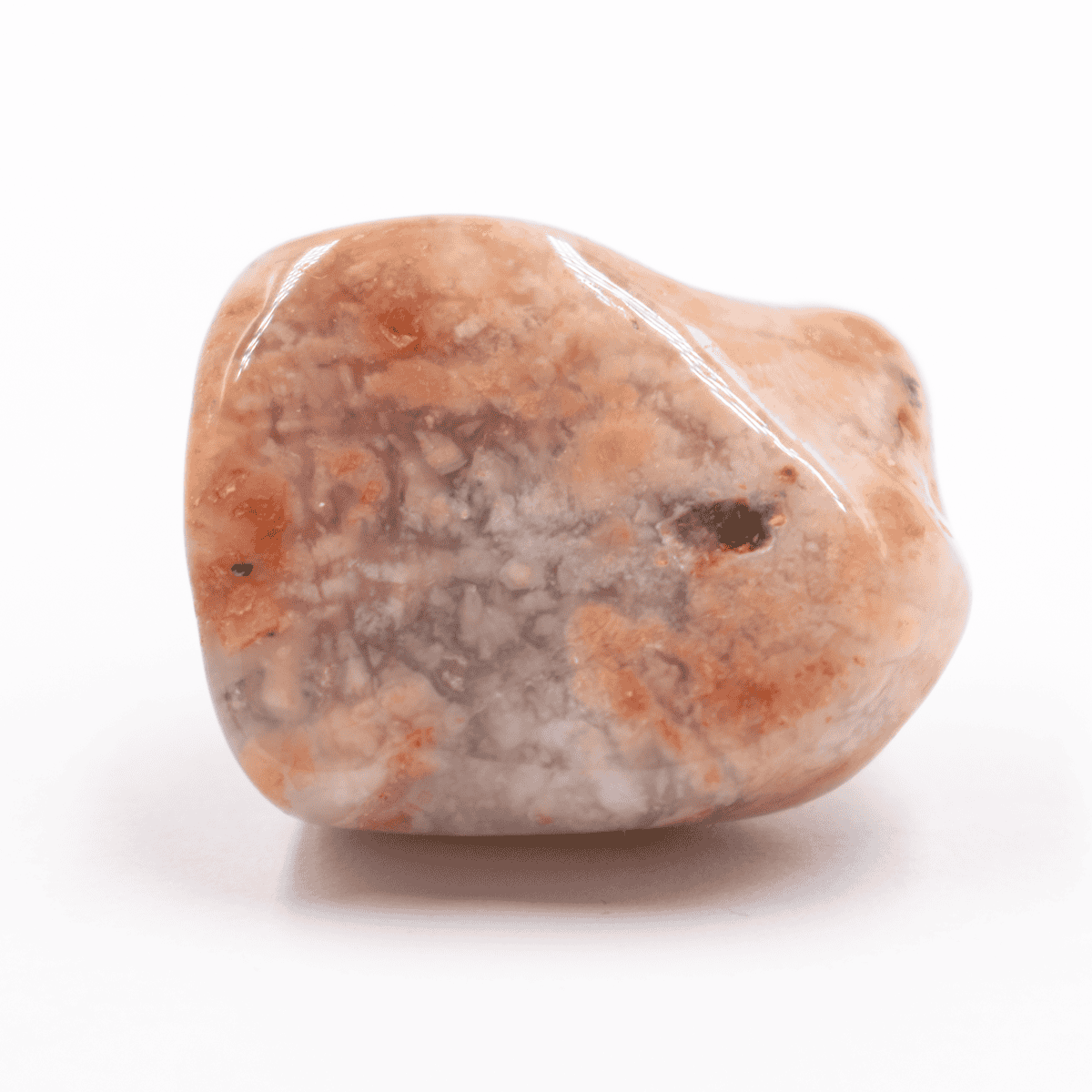 Tromlovaný achát mechový růžový je ohlazený a leštěný kámen různých tvarů v odstínech růžové, meruňkové a oranžovohnědé.