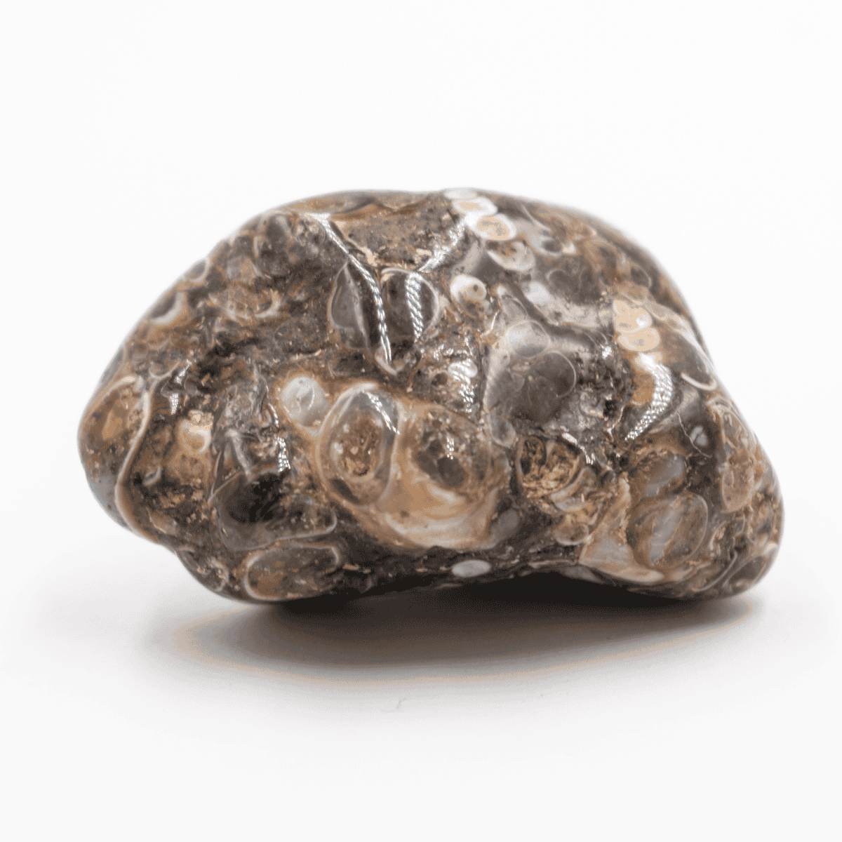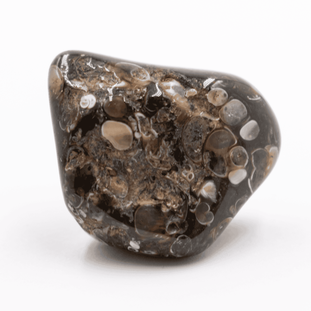 Tromlovaný achát mušlový je ohlazený a leštěný kámen různých tvarů v odstínech béžové, hnědé, namodré a šedé.