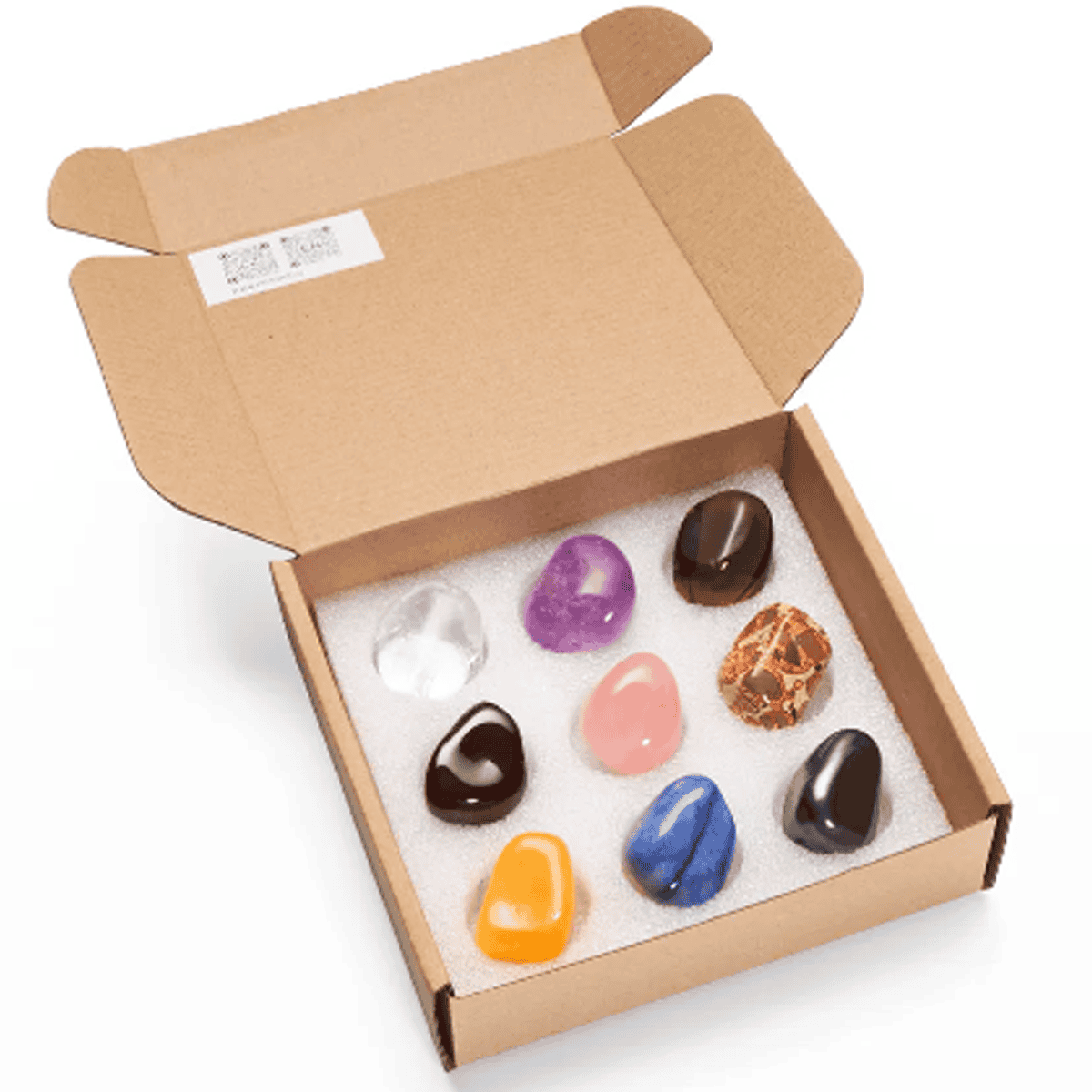 Sada obsahuje tyto oblíbené druhy kamenů: křišťál, ametyst, záhněda, granát, růženín, sopečná brekcie, kalcit žlutý, křemen modrý a hematit.