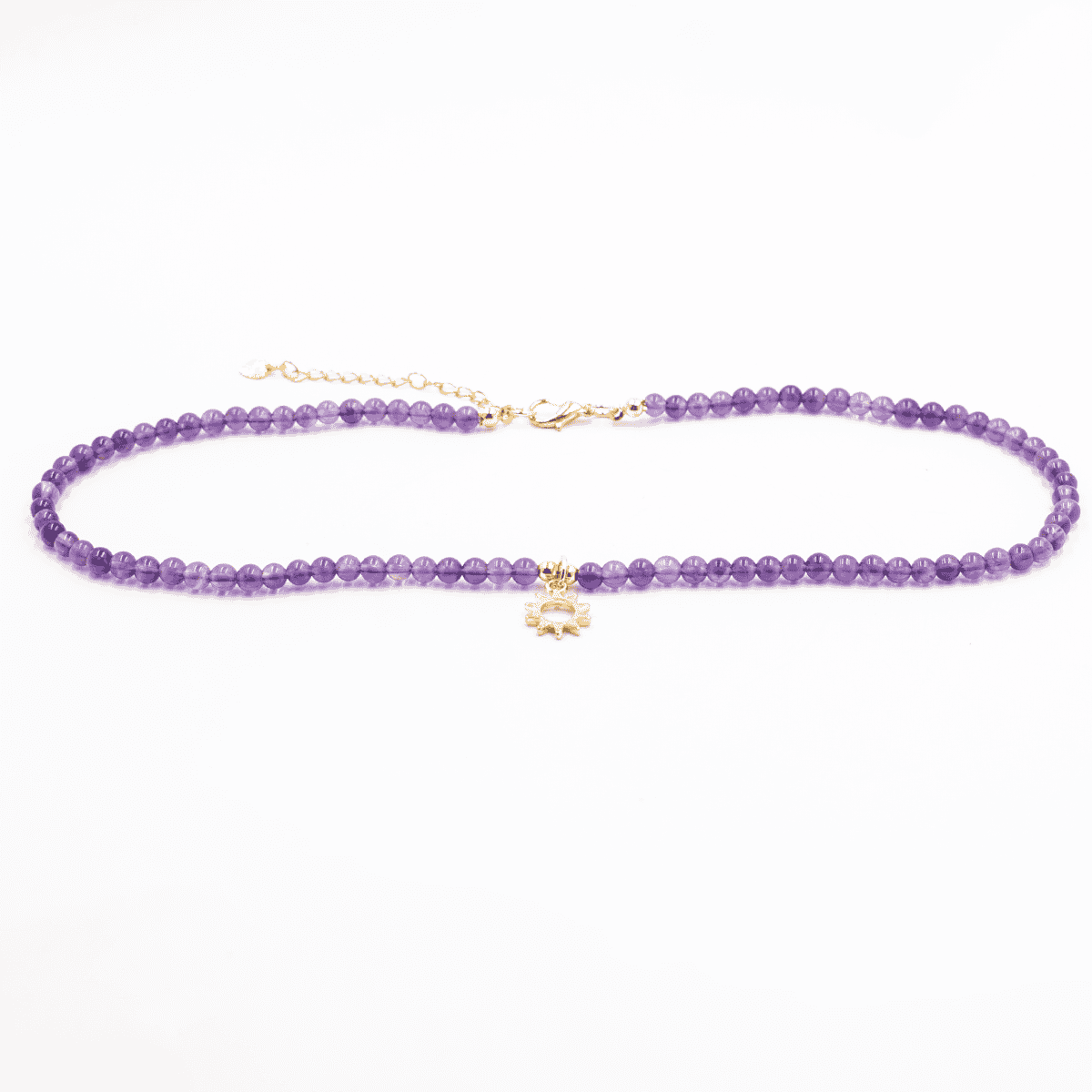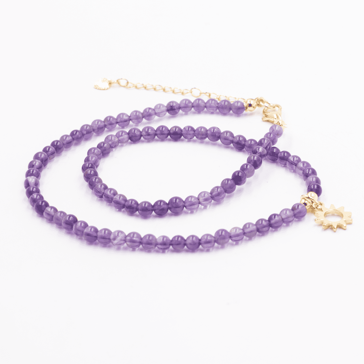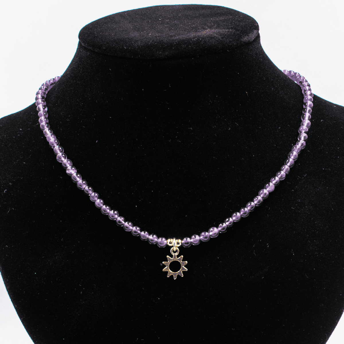 Jemný náhrdelník kombinující leštěné korálky z ametystu o velikosti 3 mm se zlatým přívěskem ve tvaru slunce, představující sílu, vitalitu a tvůrčí energii. Nastavitelný pomocí prodlužovacího řetízku o délce ±5 cm.