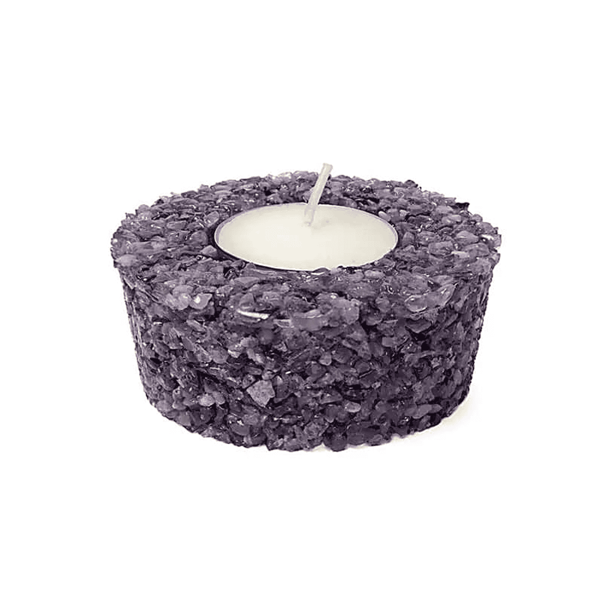 Kulatý svícen na čajovou svíčku, vyrobený z kousků ametystu.
