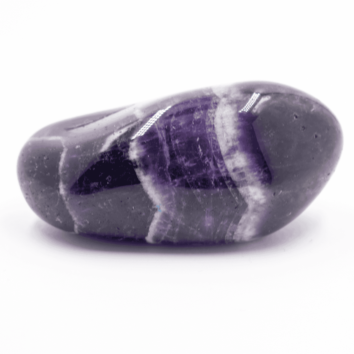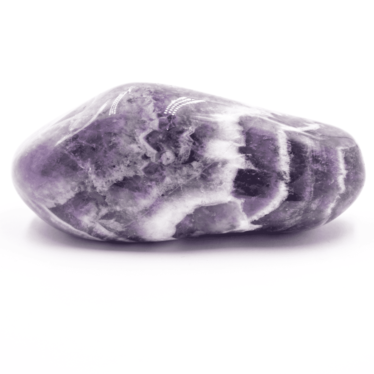 Tromlovaný ametyst je ohlazený a leštěný kámen různých tvarů v odstínu fialové a bílé barvy.