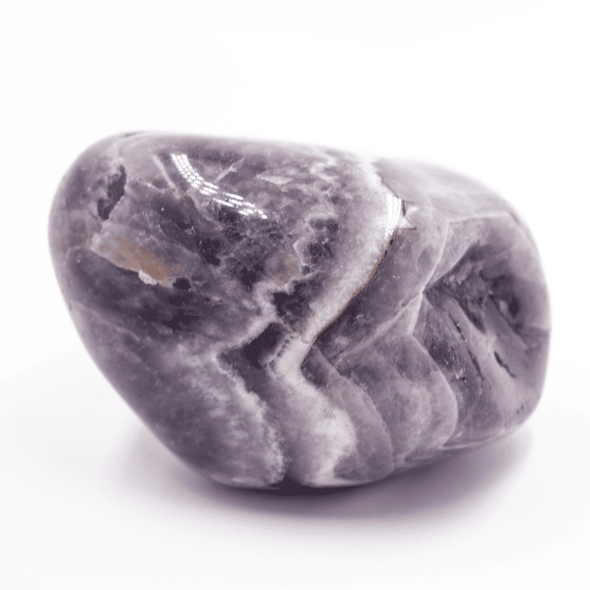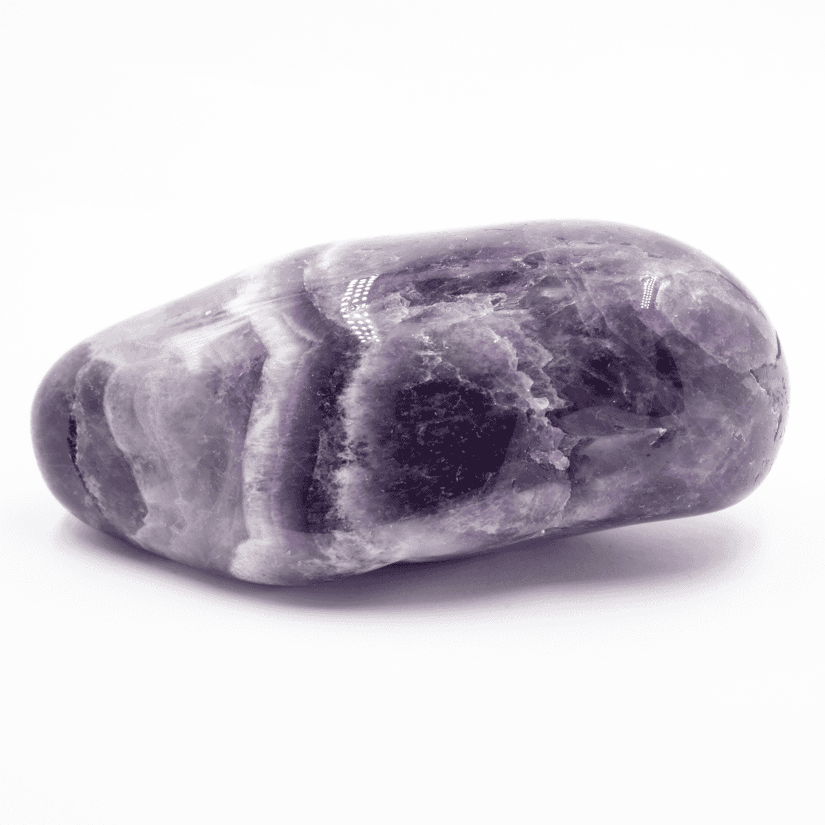 Tromlovaný ametyst je ohlazený a leštěný kámen různých tvarů v odstínu fialové a bílé barvy.