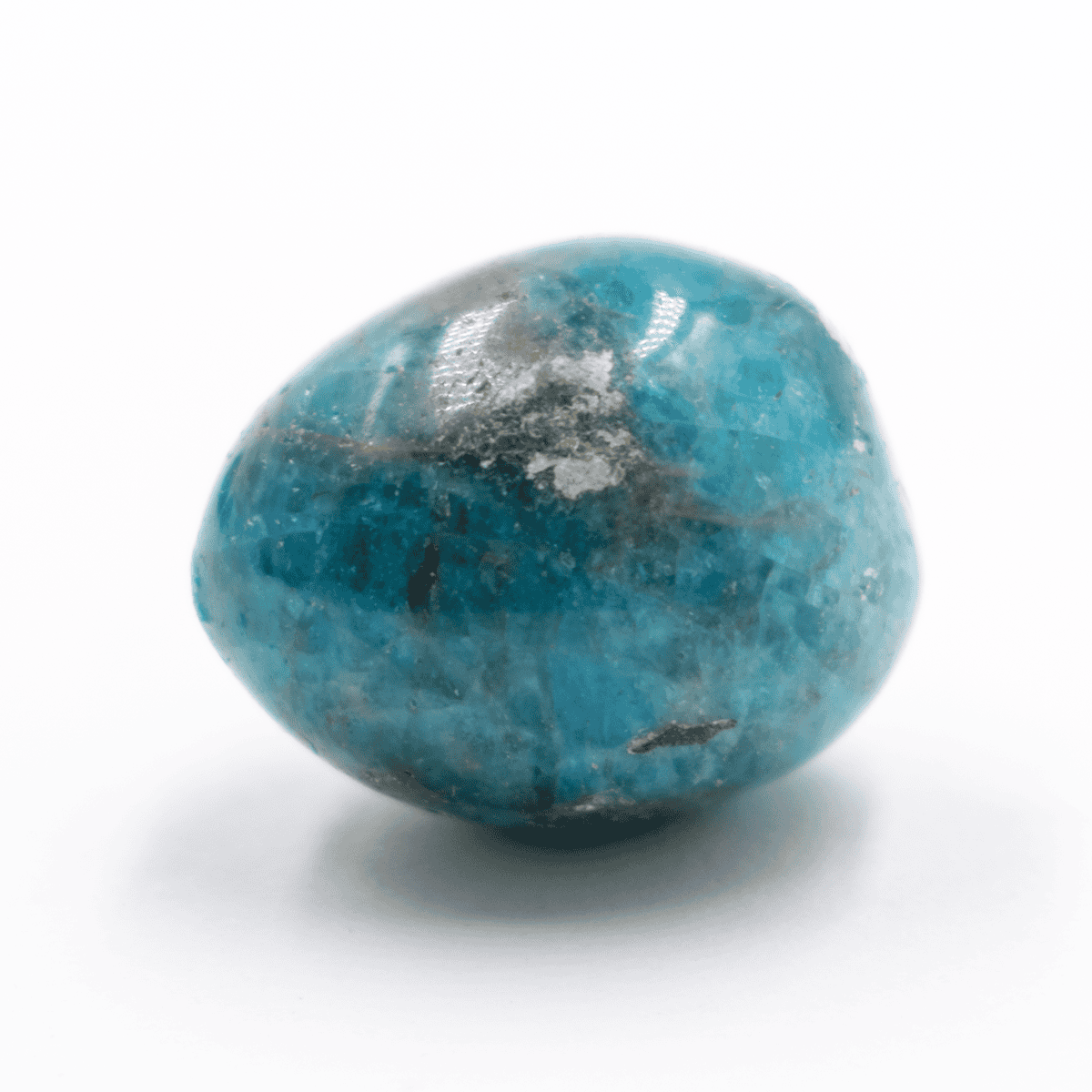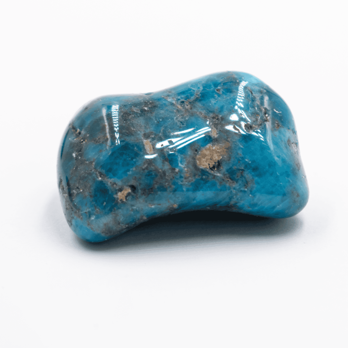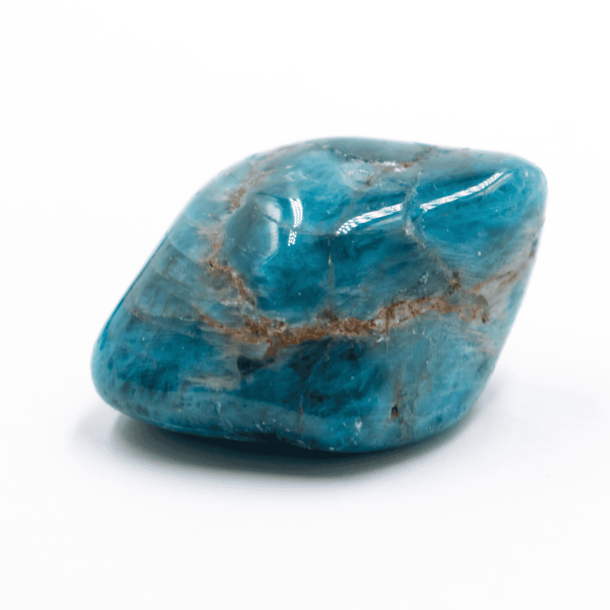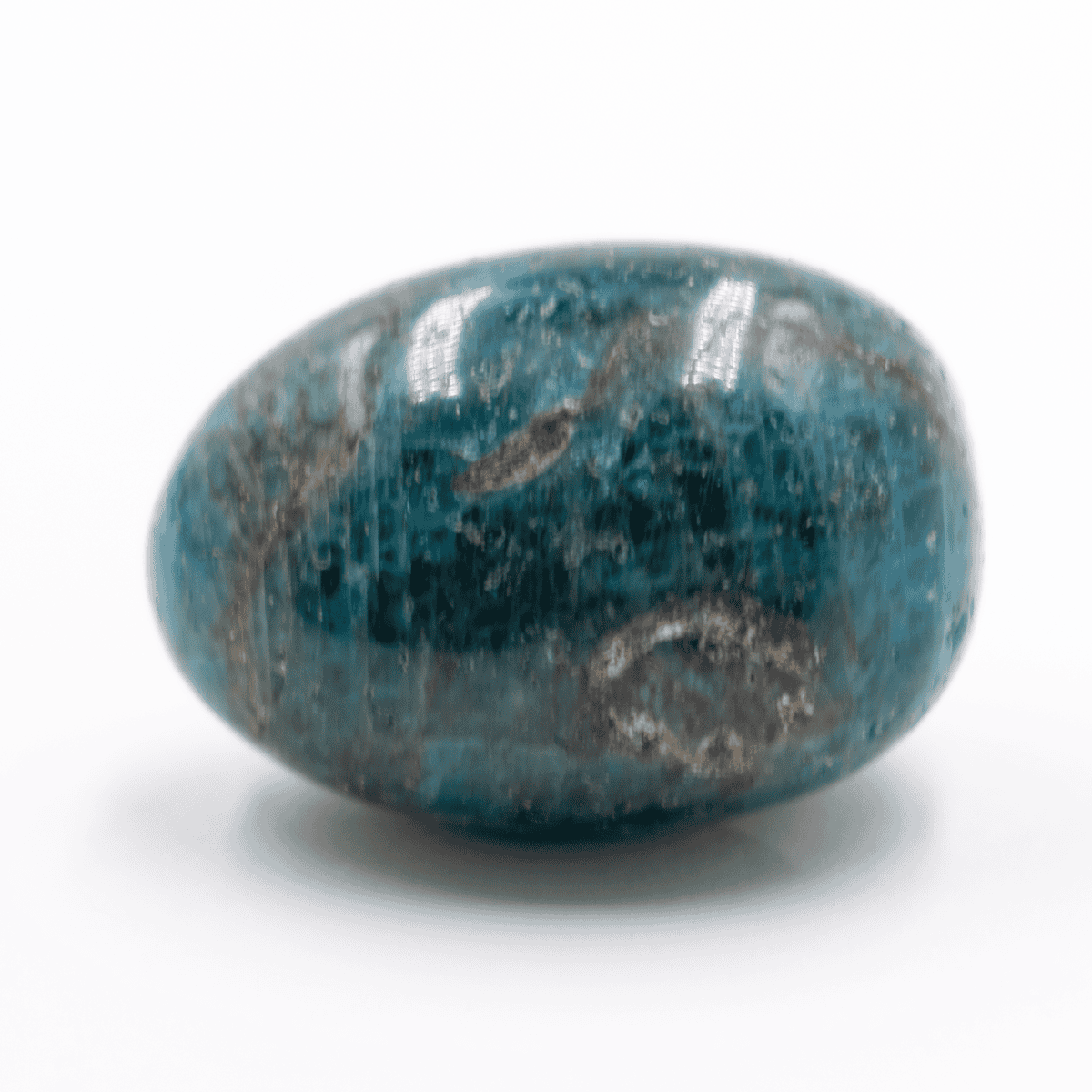Tromlovaný apatit je ohlazený a leštěný kámen různých tvarů v odstínech hnědé, modré, šedé a zelené.