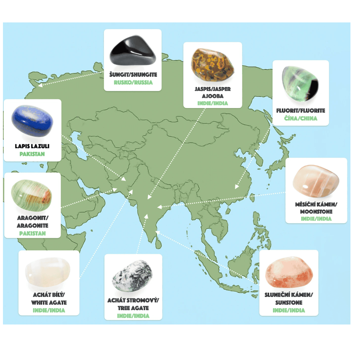 Unikátní zeměpisná sbírka ASIE obsahuje devět tromlovaných kamenů o velikosti cca 3 cm. Každý kámen pochází z jiné části asijského kontinentu. Názvy, popisy i přesné lokace jednotlivých kamenů jsou uvedeny na webové stránce, na kterou se zákazníci dostanou po načtení QR kódu na krabičce.