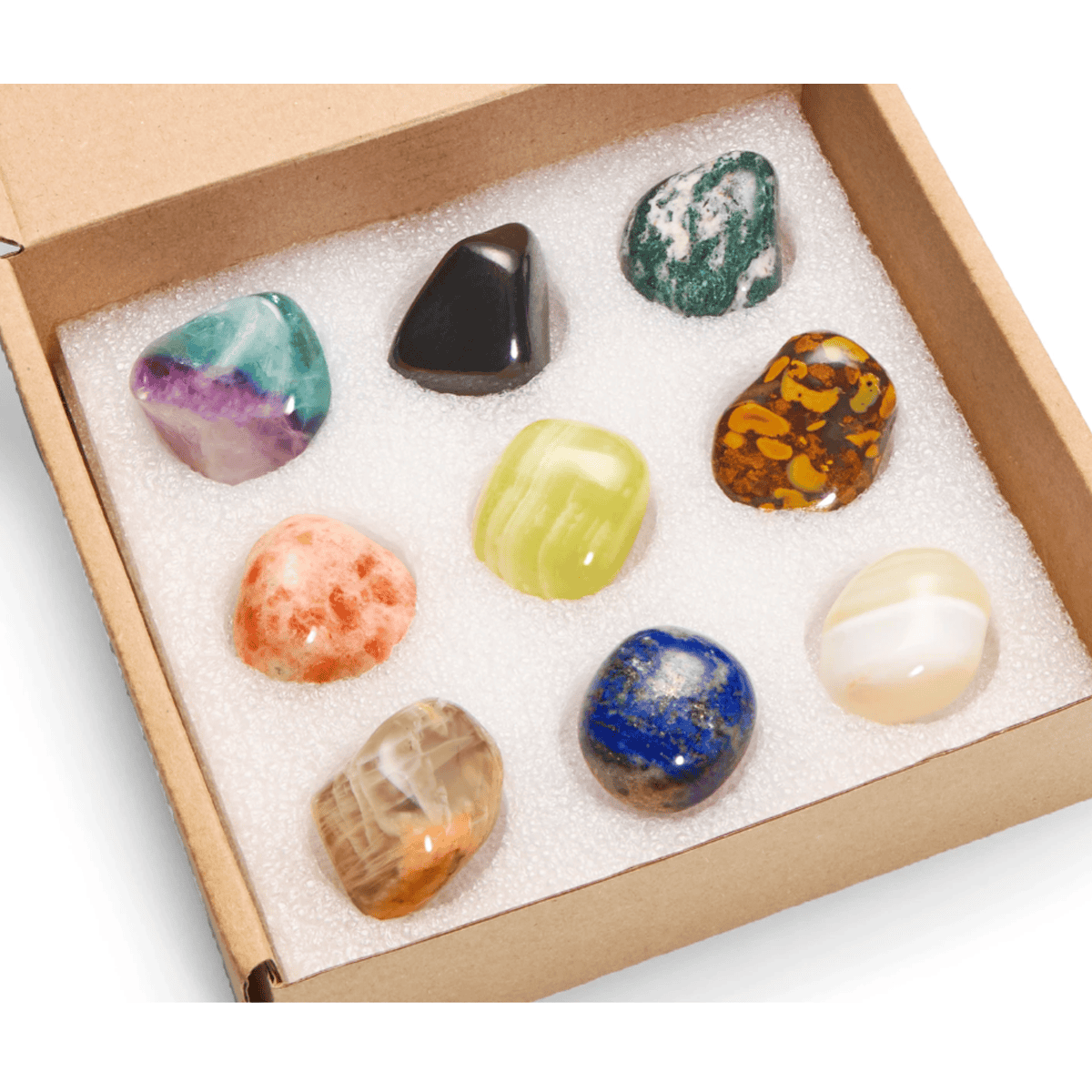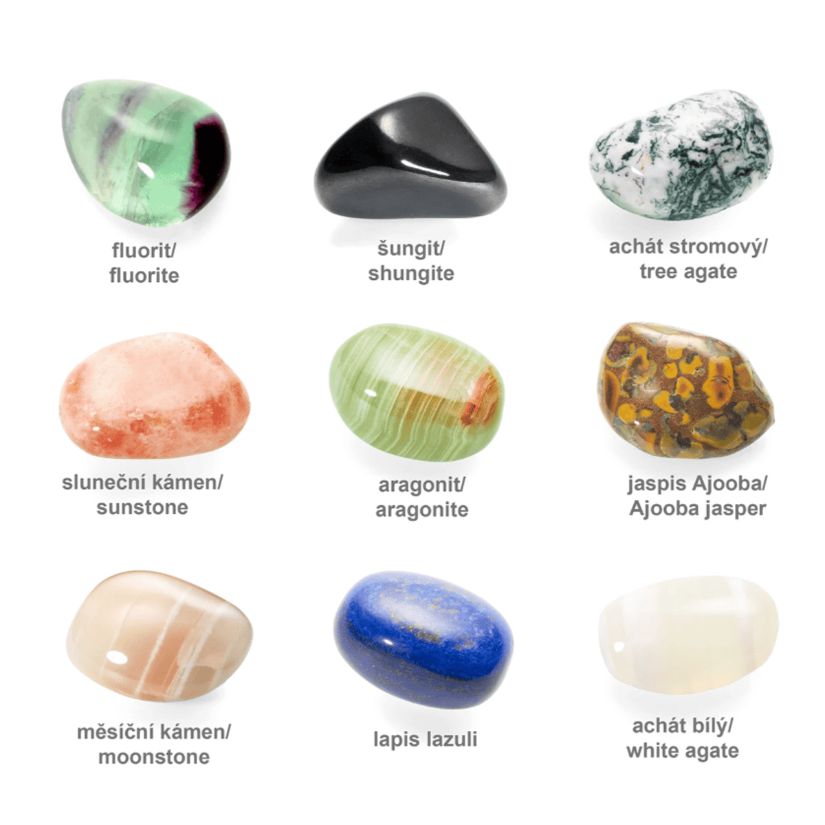 Sada obsahuje tyto oblíbené druhy kamenů: fluorit, šungit, achát stromový, sluneční kámen, aragonit, jaspis Ajooba, měsíční kámen, lapis lazuli a achát bílý.