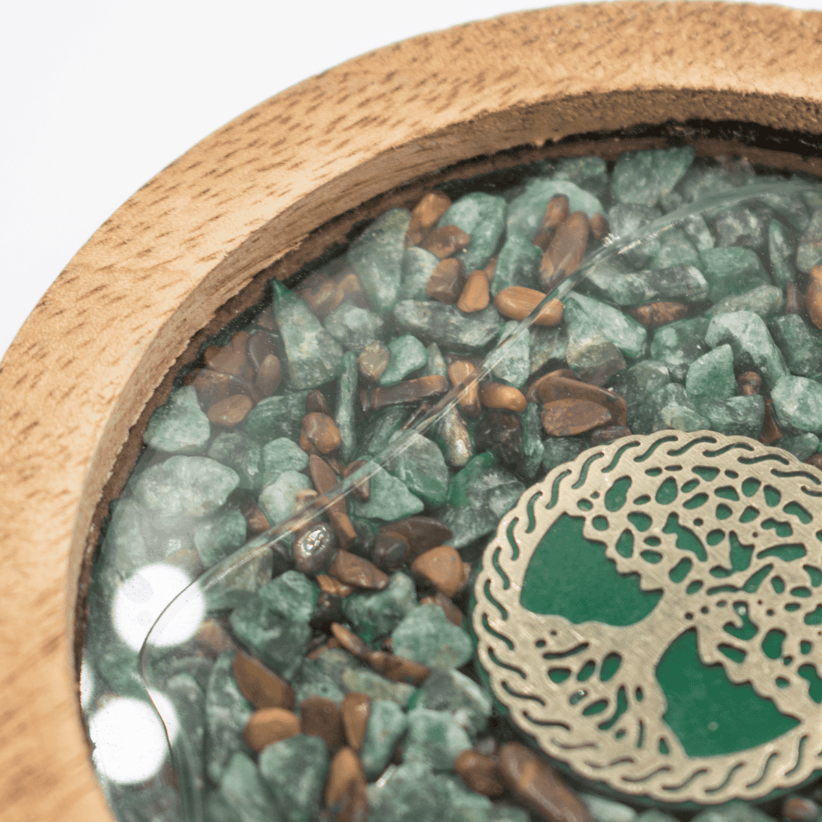 Přidejte ke svému nápoji nádech mystiky pomocí podtácků s minerály. Podtácek připomíná orgonit, má dřevěný vnější okraj, zatímco střed je vyroben z minerálů a zdobené, vodivé kovové části zalité polyesterovou pryskyřicí.