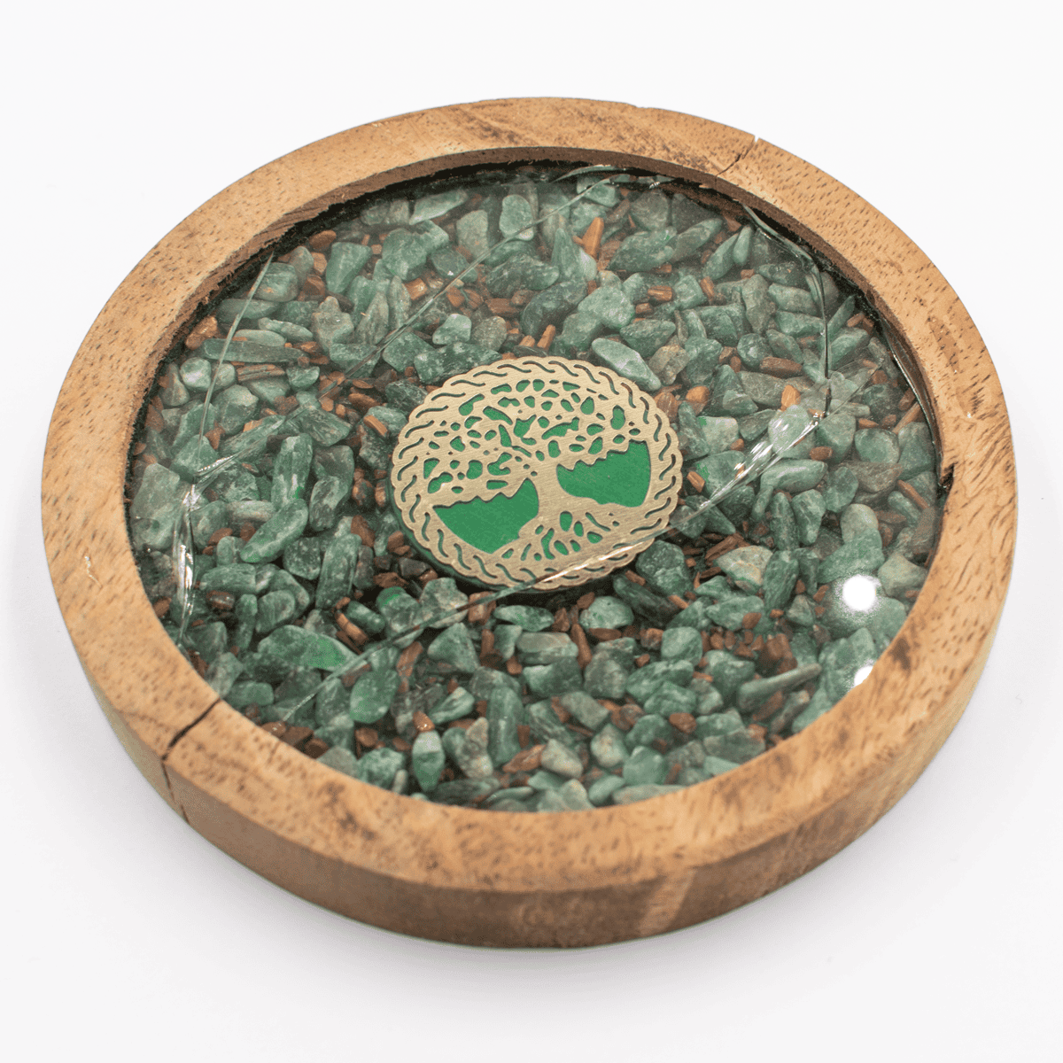 Přidejte ke svému nápoji nádech mystiky pomocí podtácků s minerály. Podtácek připomíná orgonit, má dřevěný vnější okraj, zatímco střed je vyroben z minerálů a zdobené, vodivé kovové části zalité polyesterovou pryskyřicí.