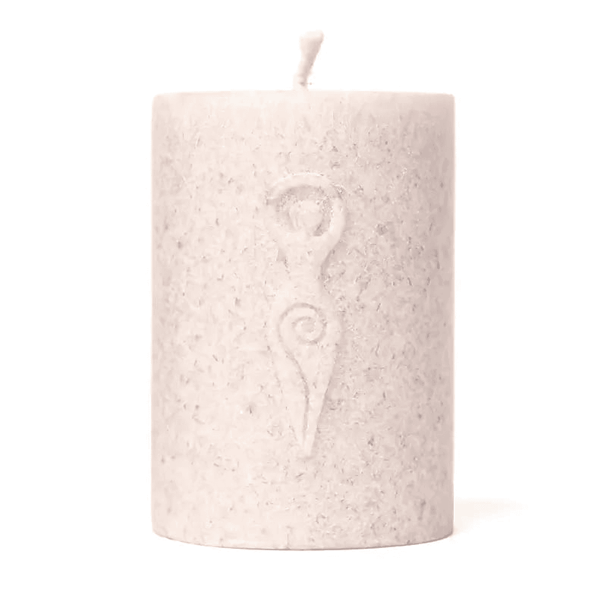Jemně růžová stearinová svíčka s vyvýšeným vyobrazením postavy Bohyně. Silné znázornění božské ženskosti, mateřské intuice a cyklické obnovy pro ty, kteří s úmyslem překračují životní prahy.