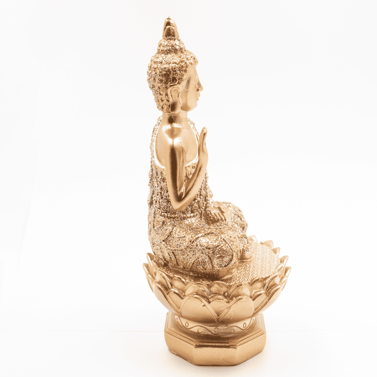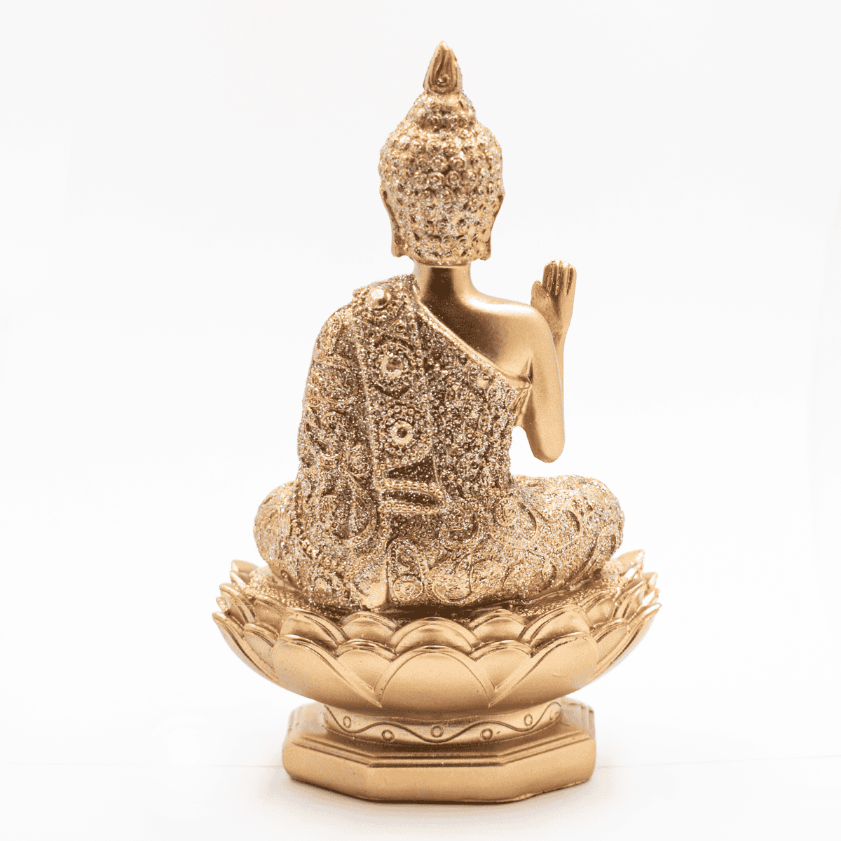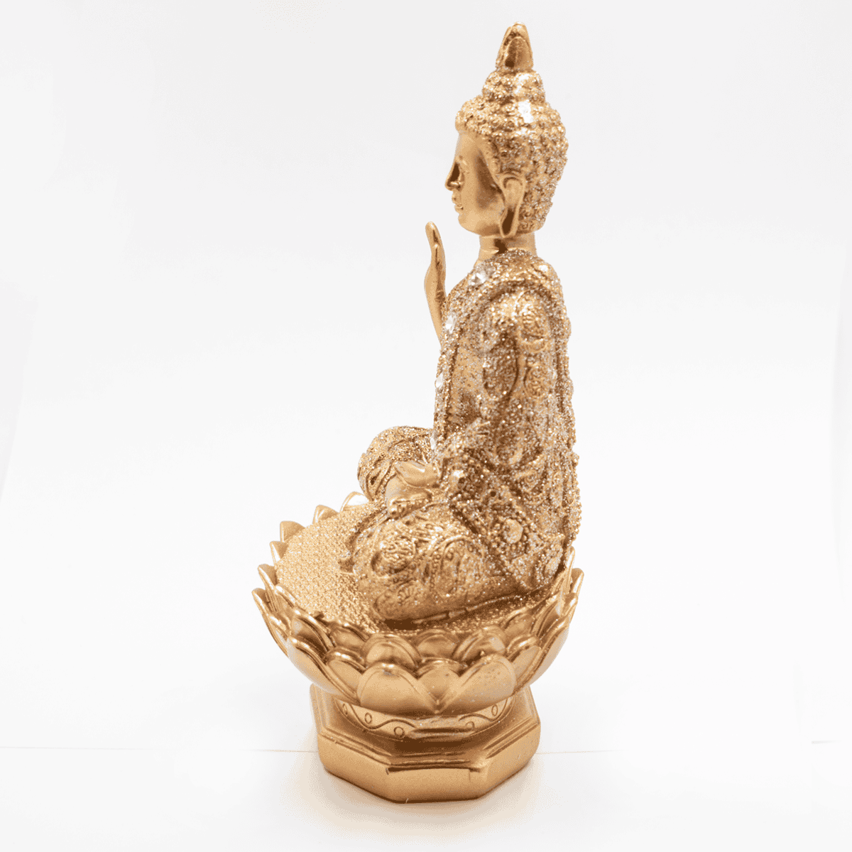 Soška Buddhy ve zlaté barvě zdobená třpytkami a skleněnými kamínky.