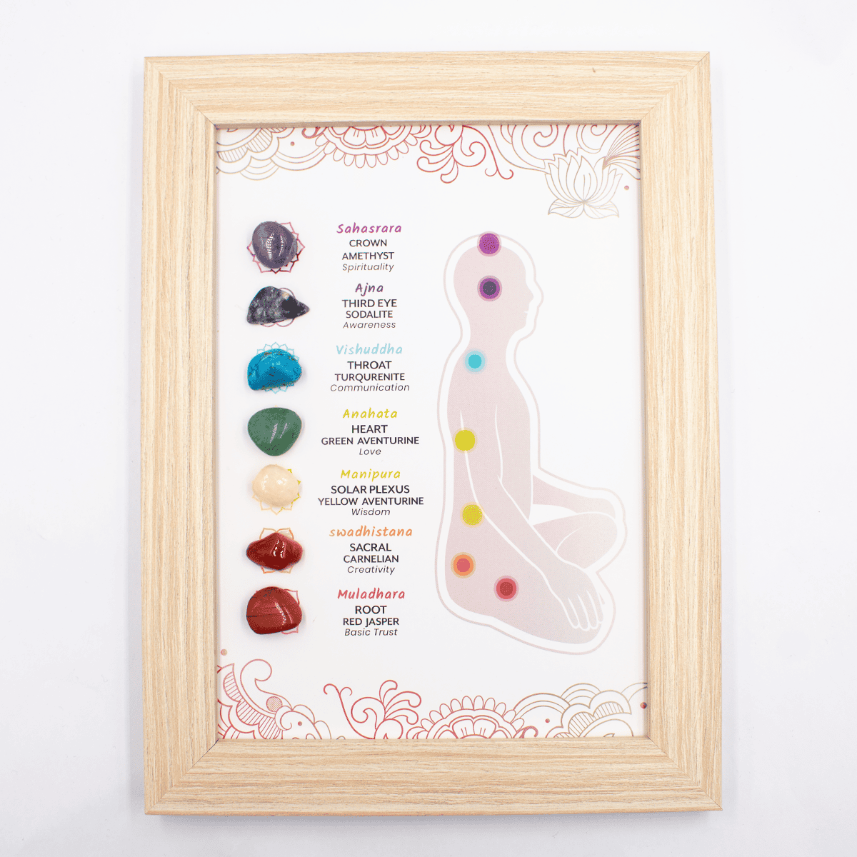 Čakrové minerály jsou z ametystu, sodalitu, tyrkenitu, zeleného avanturínu, citrínu, karneolu a červeného jaspisu.