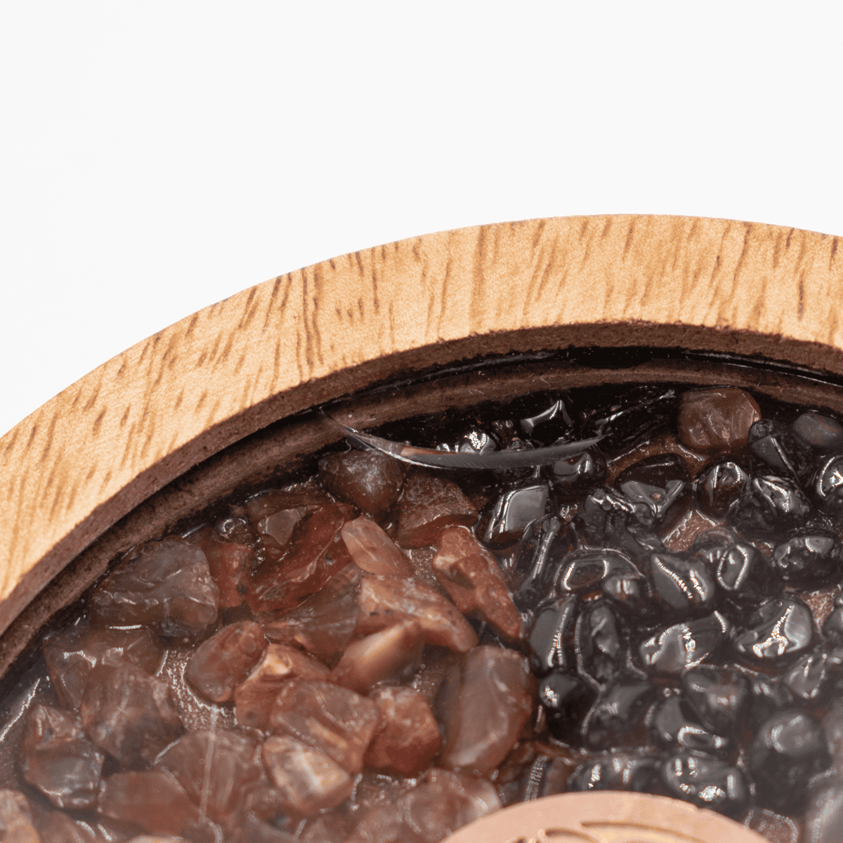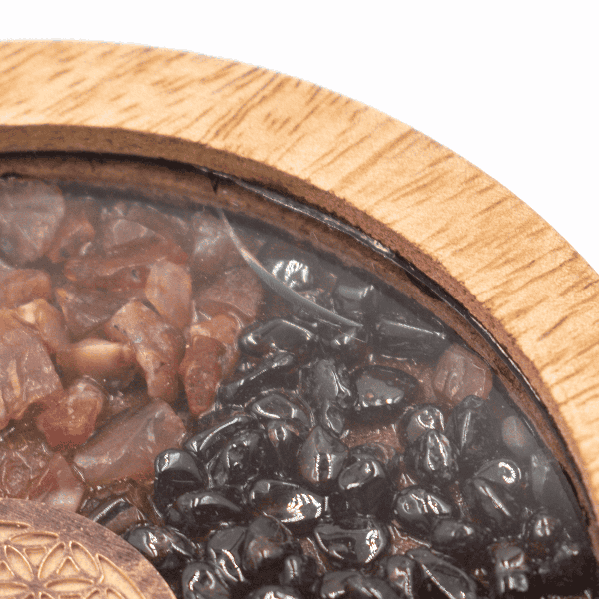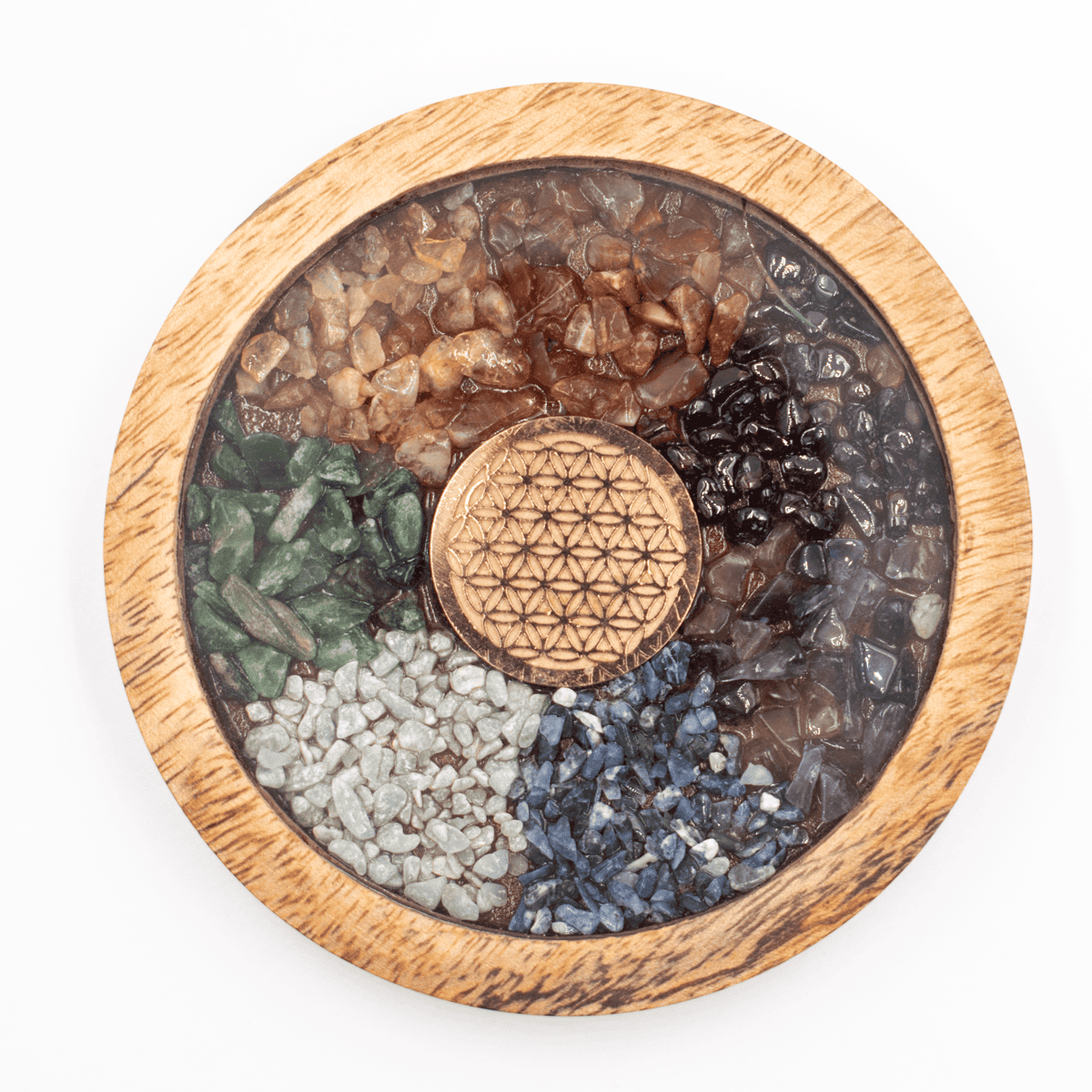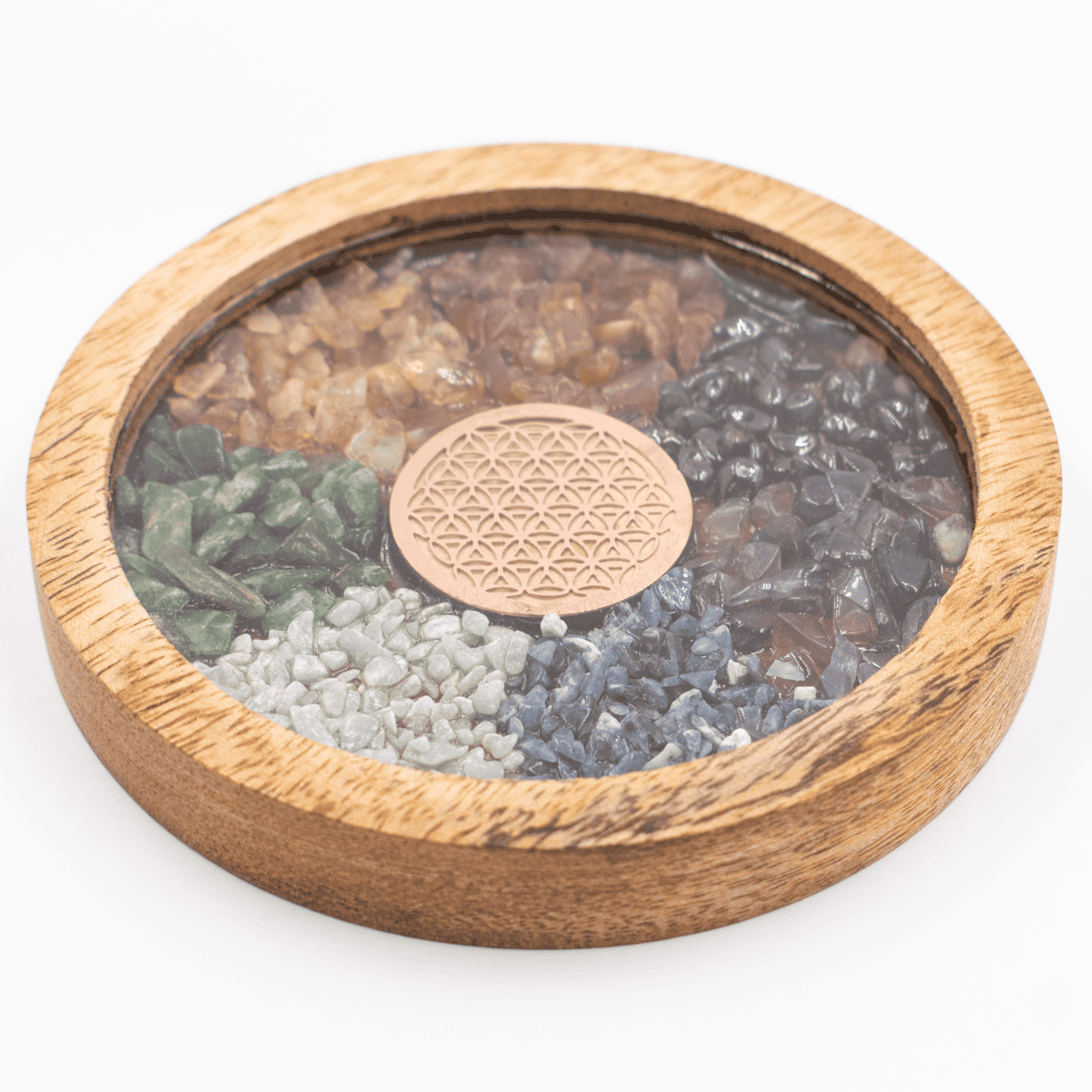 Podtácek s vnějším okrajem z mangového dřeva je vyplněn polodrahokamy a symbolem Květu života z vodivé mědi. To zvyšuje energii kamenů, podobně jako orgonit. Odlitý z polyesterové pryskyřice.