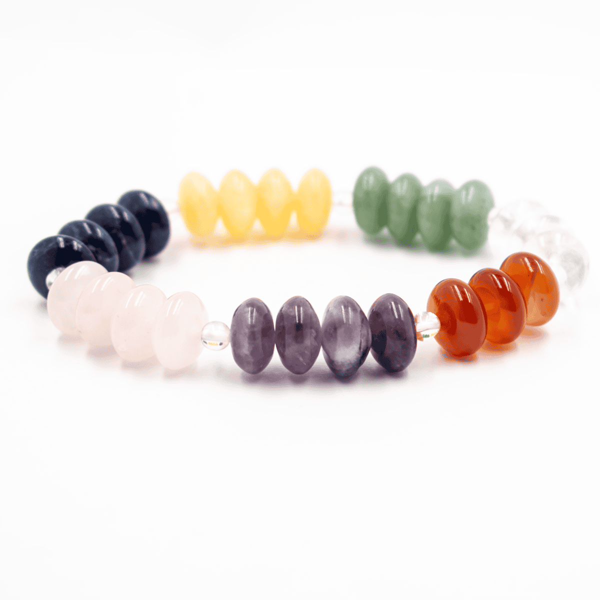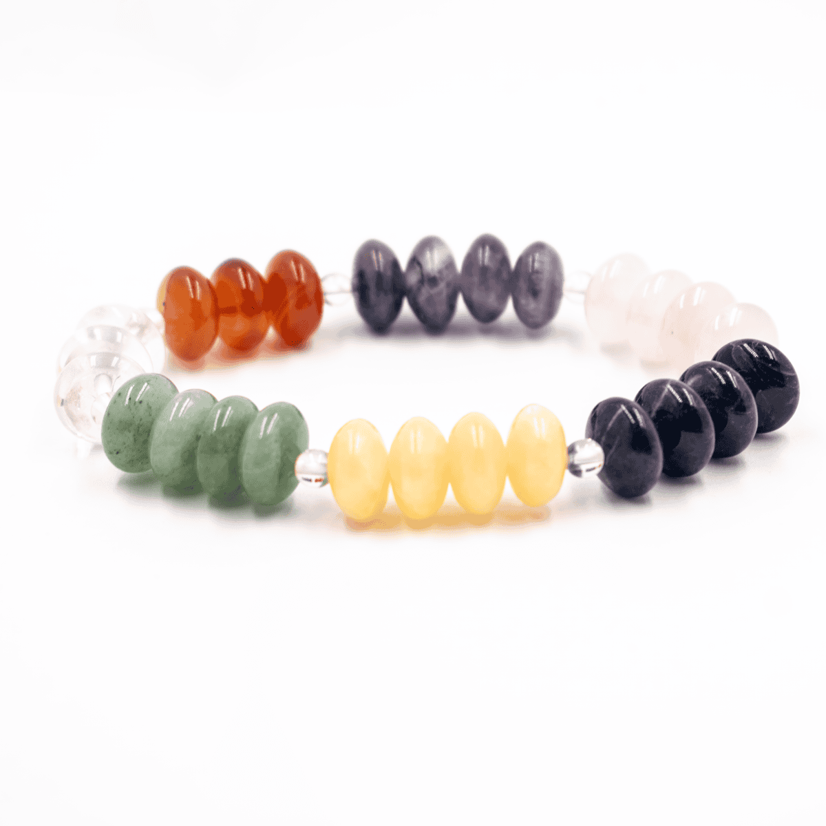 Náramek se skládá z ametystu, sodalitu, kalcitu, zeleného avanturínu, karneolu, křišťálu a růženínu.