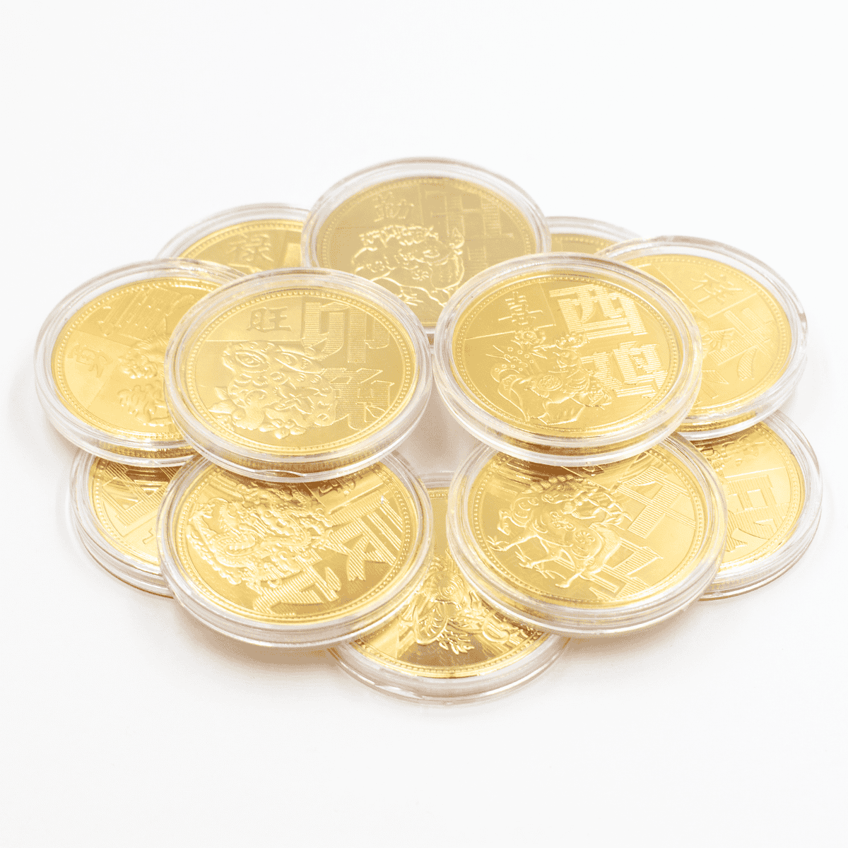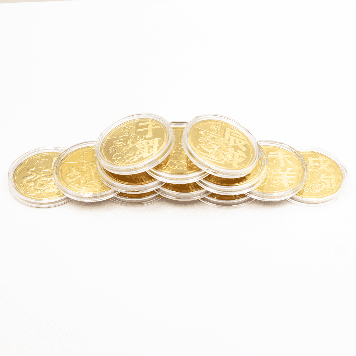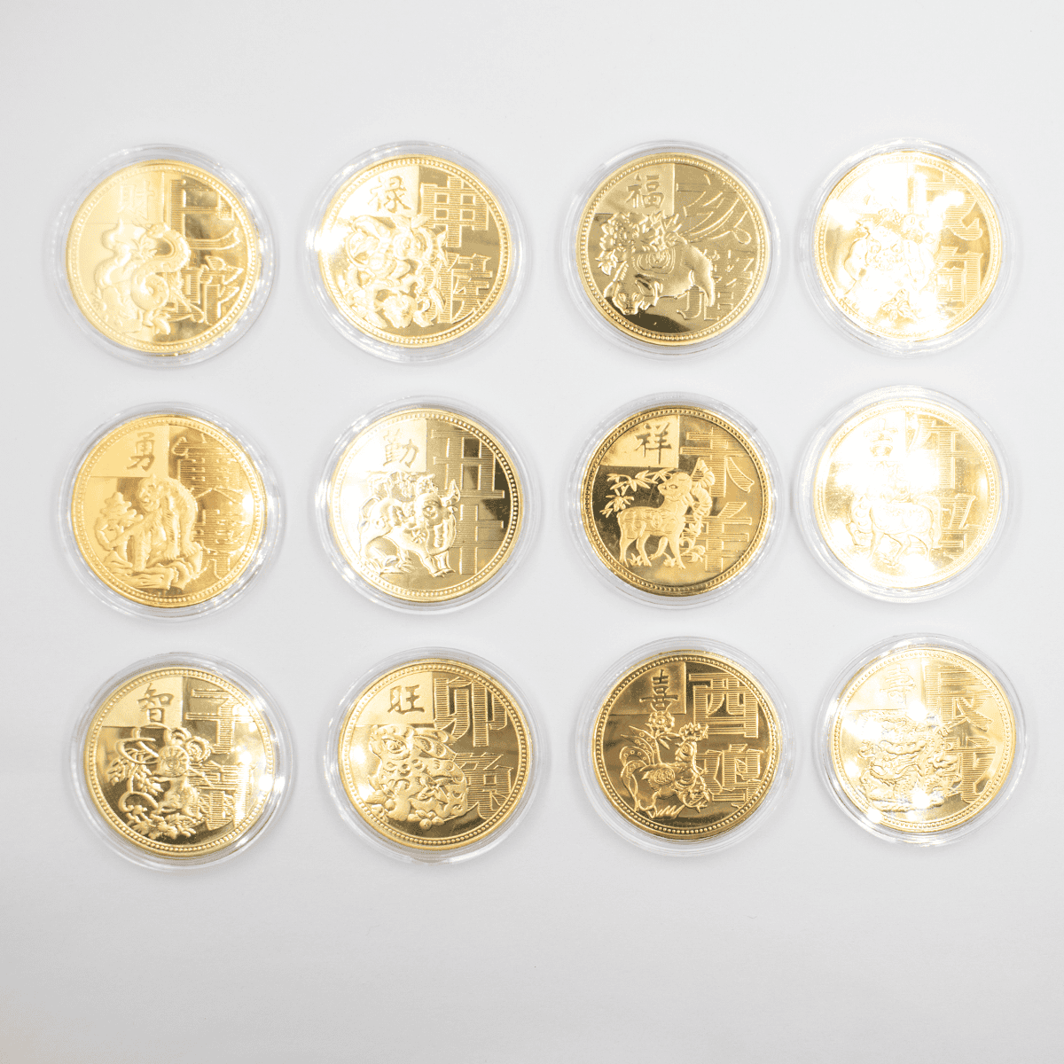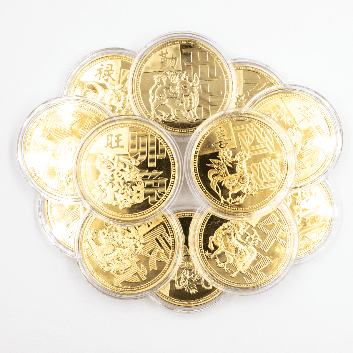 Sada obsahuje mince: krysa, zajíc, kůň, kohout, buvol, drak, koza, pes, tygr, had, opice a prase.