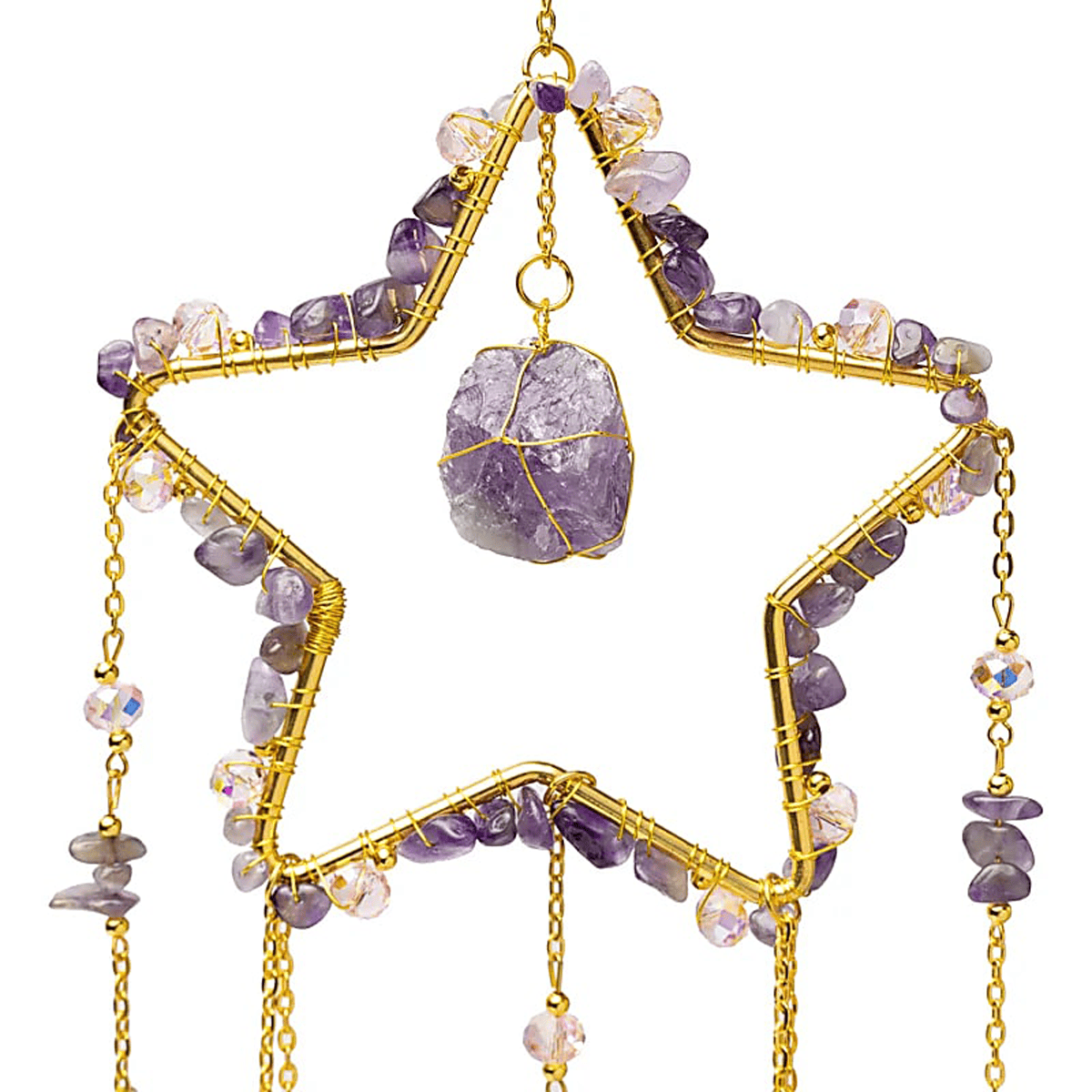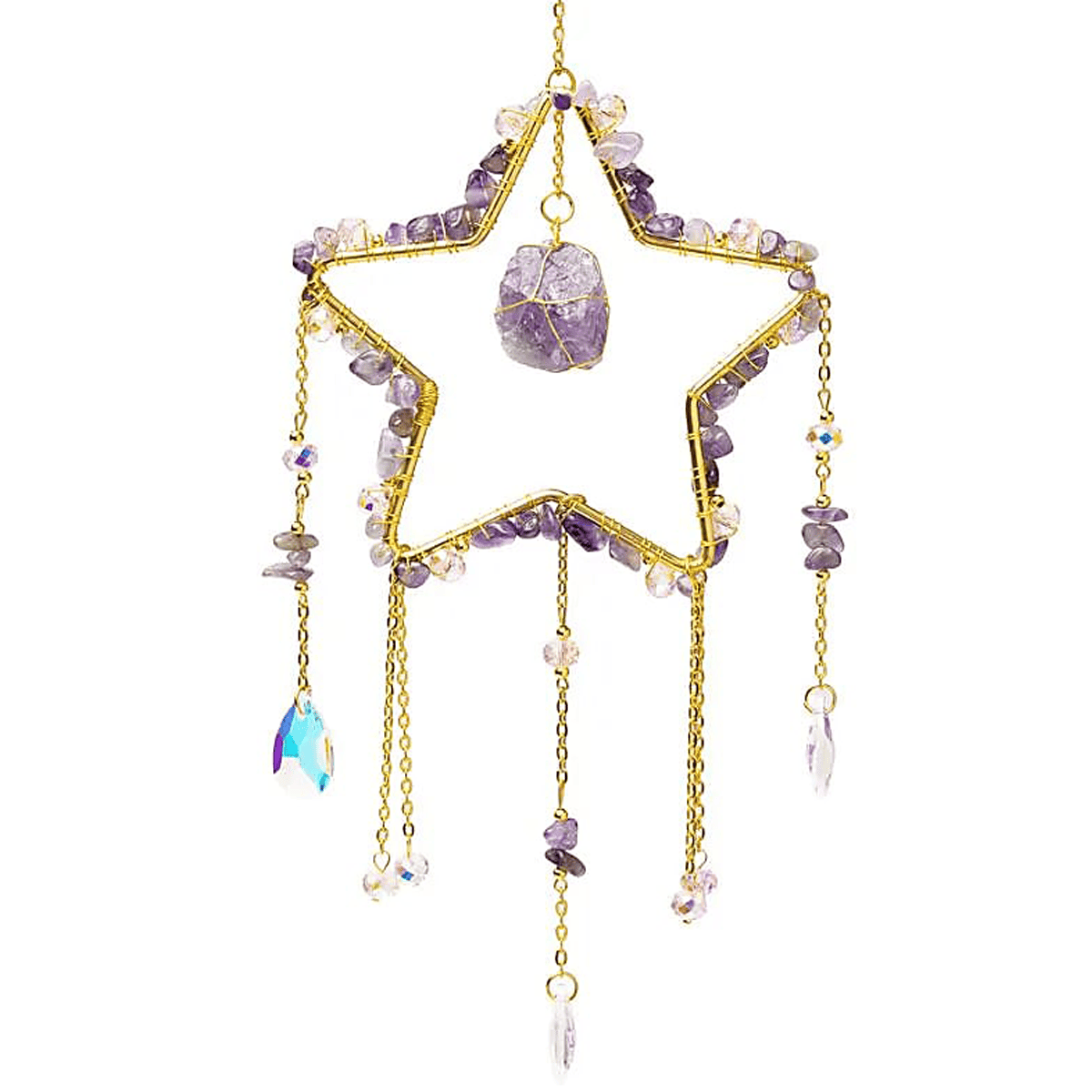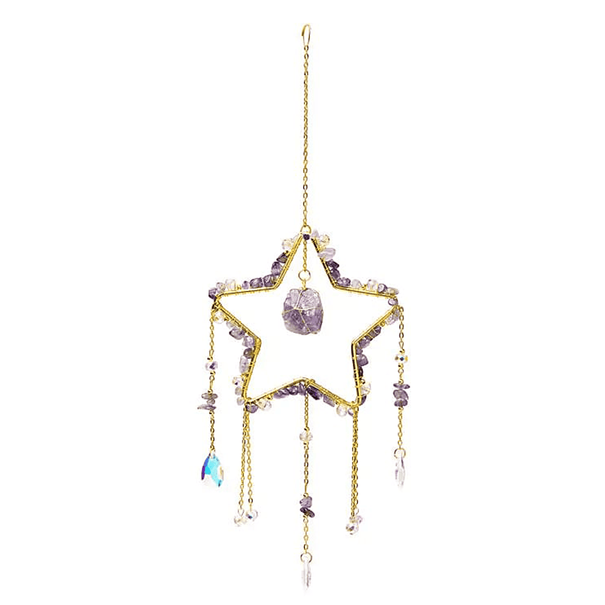 Křišťálový závěs dodá vašemu prostoru malebný a lehký nádech. Nádherný lapač slunce ve tvaru hvězdy. Je vyroben z propracovaného drátěného rámu a je doplněn barevně třpytivými korálky, skleněnými přívěsky ve tvaru kapky s akcenty z přírodního ametystu.