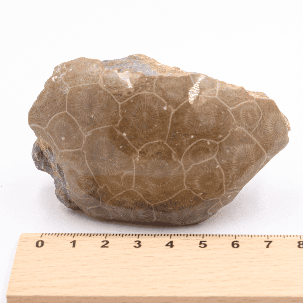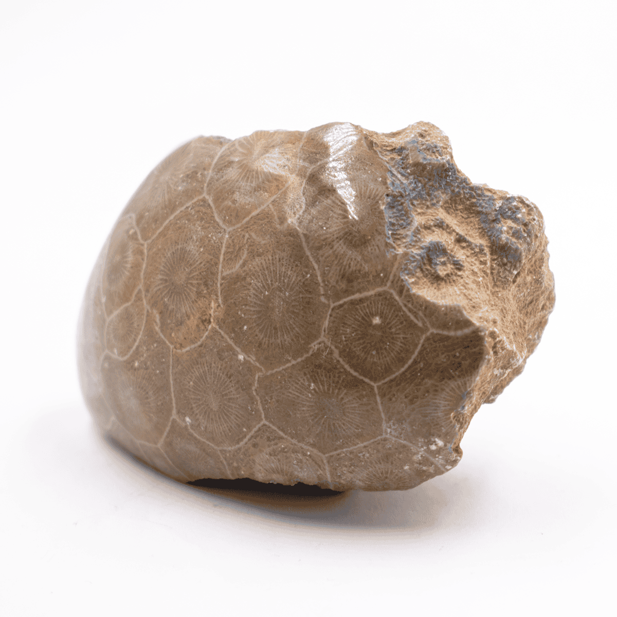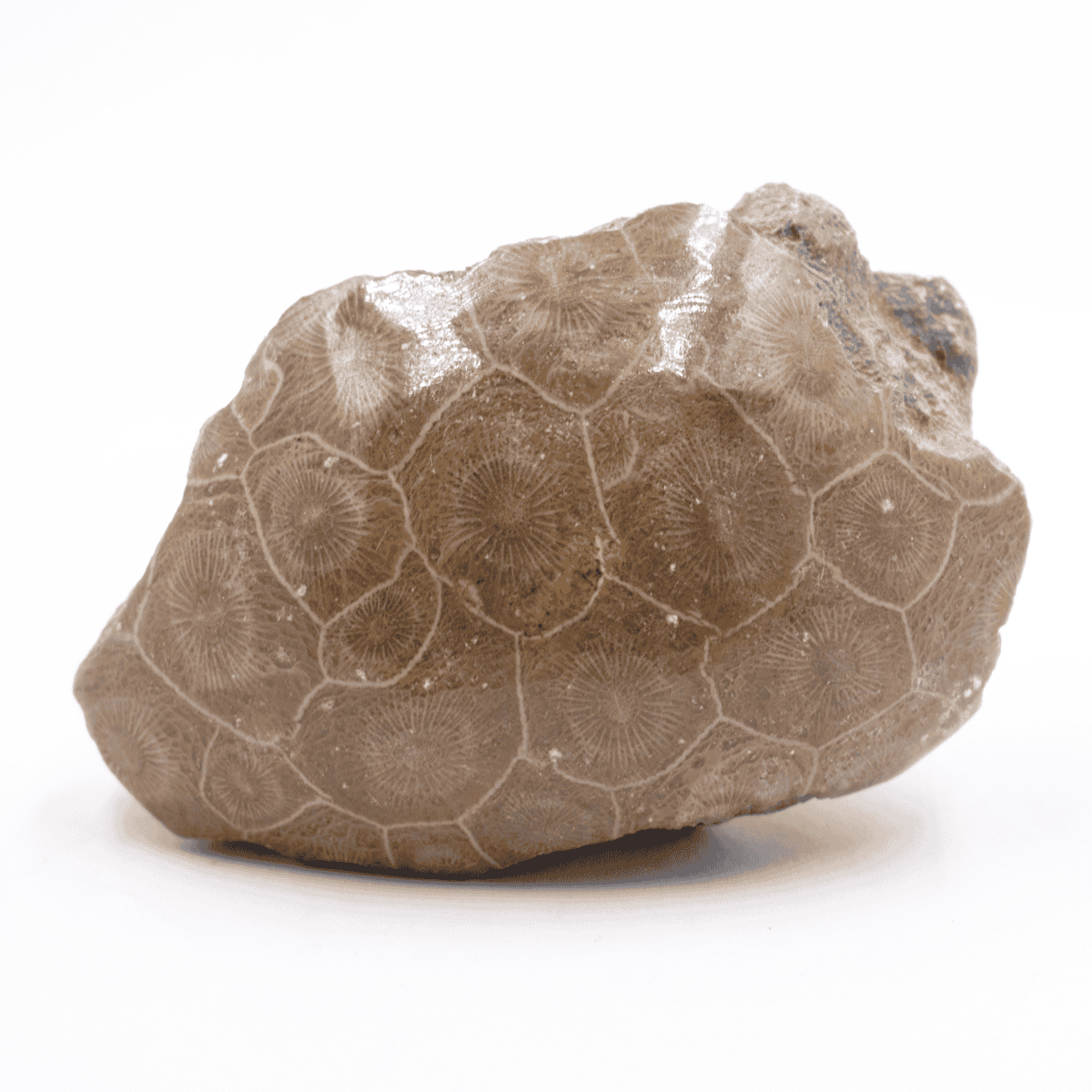 Leštěný fosilní korál s dobře zachovalou vnitřní strukturou jednotlivých jedinců.