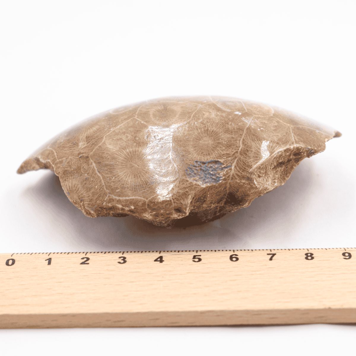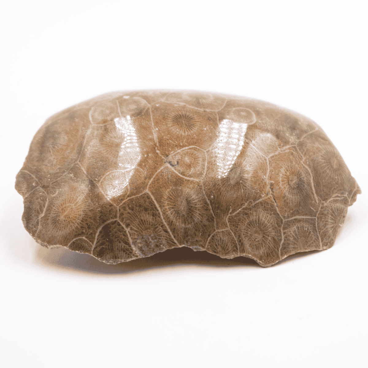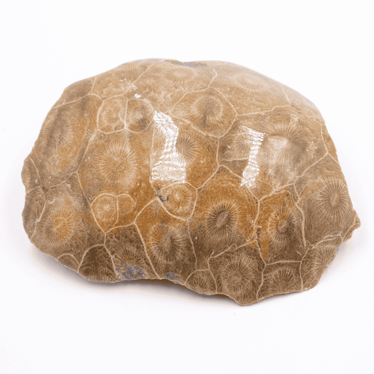 Leštěný fosilní korál s dobře zachovalou vnitřní strukturou jednotlivých jedinců.