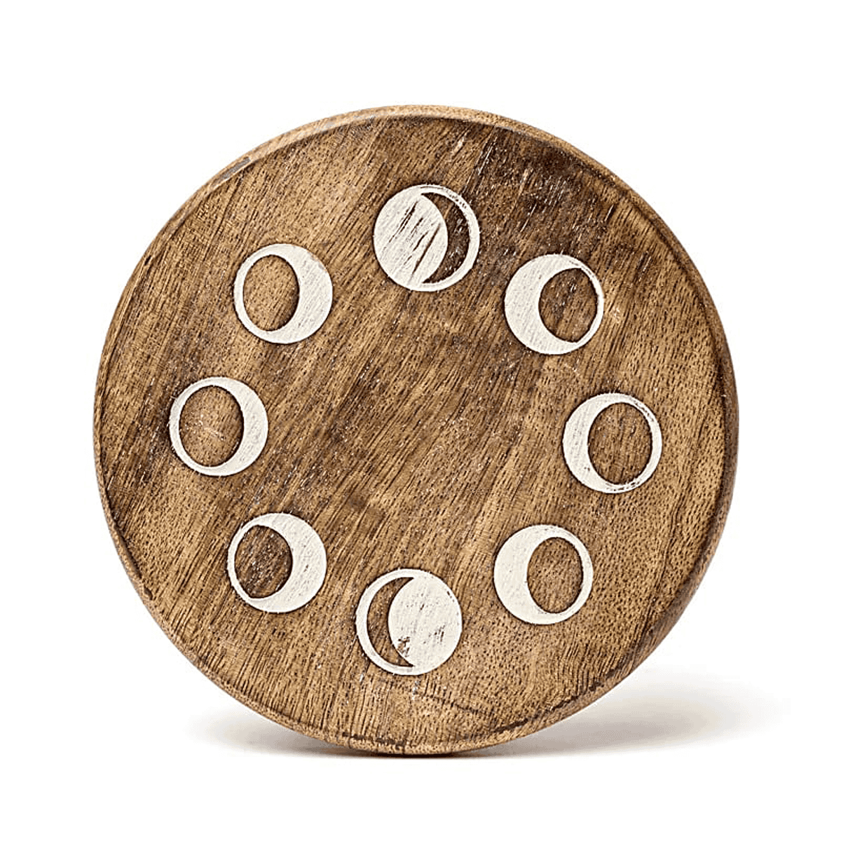 Kompaktní stolek vyrobený z masivního mangového dřeva s bílým gravírovaným obrázkem měsíčních fází na horní desce.