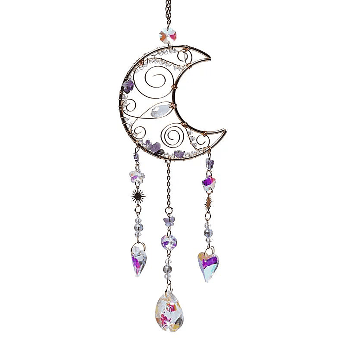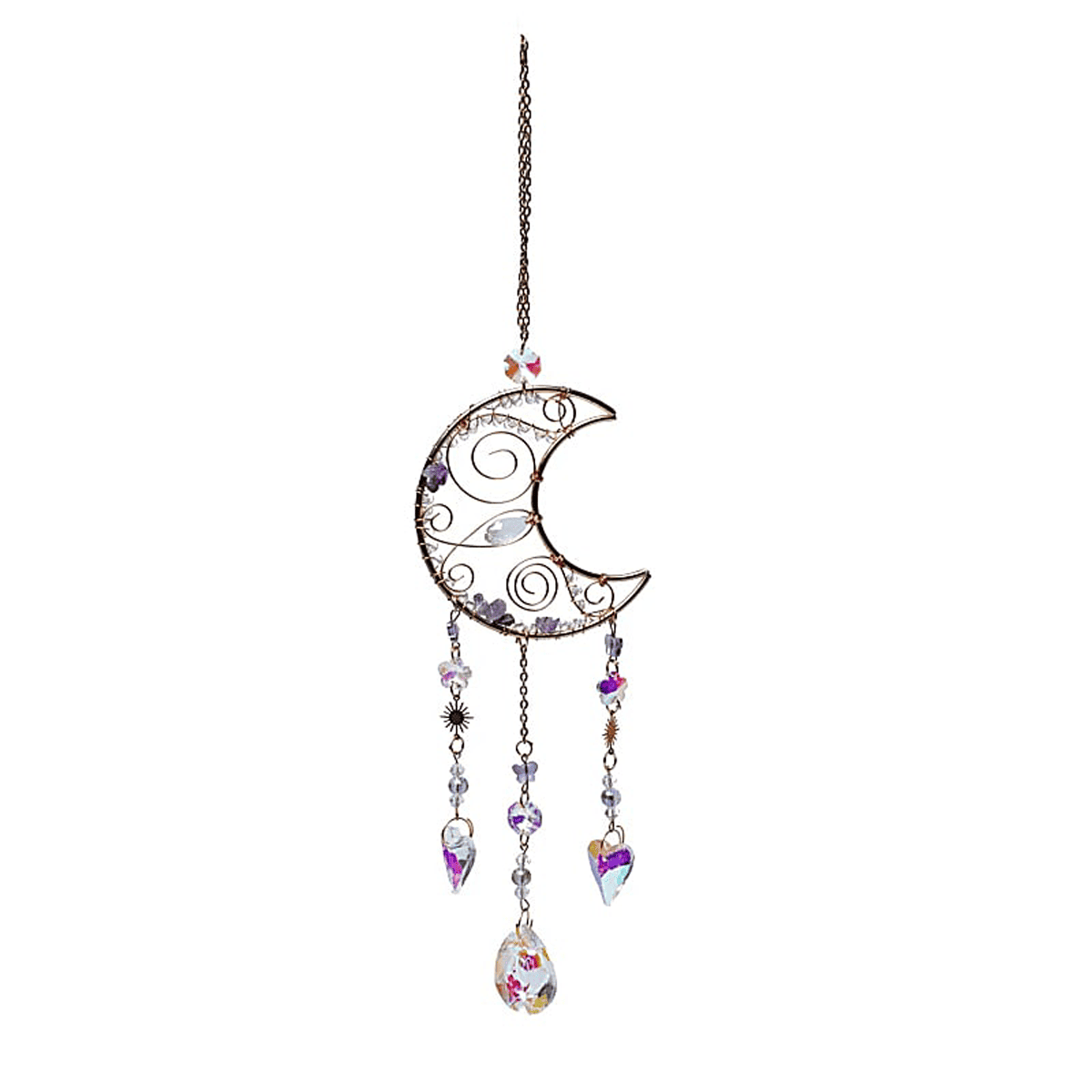 Křišťálový závěs dodá vašemu prostoru malebný a lehký nádech. Nádherný lapač slunce ve tvaru půlměsíce. Je vyroben z propracovaného drátěného rámu a je doplněn barevně třpytivými korálky, skleněnými přívěsky ve tvaru srdce a kapky s akcenty z přírodního ametystu.