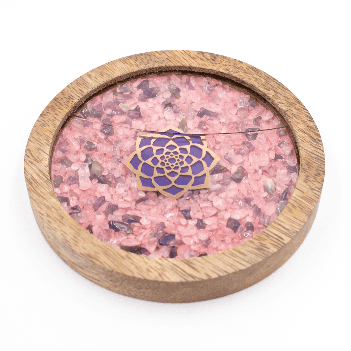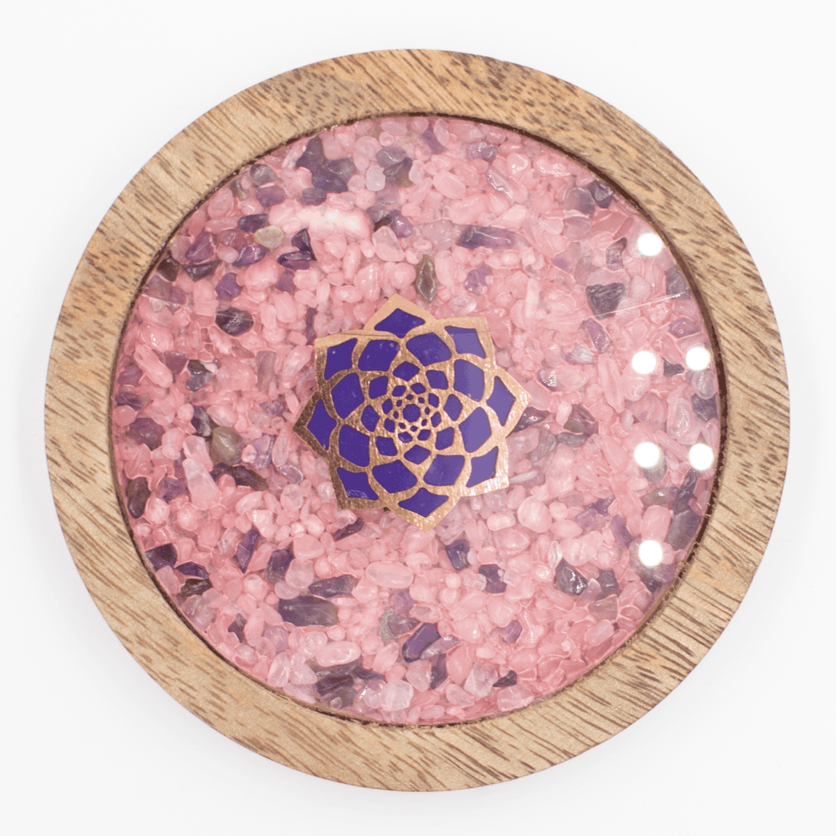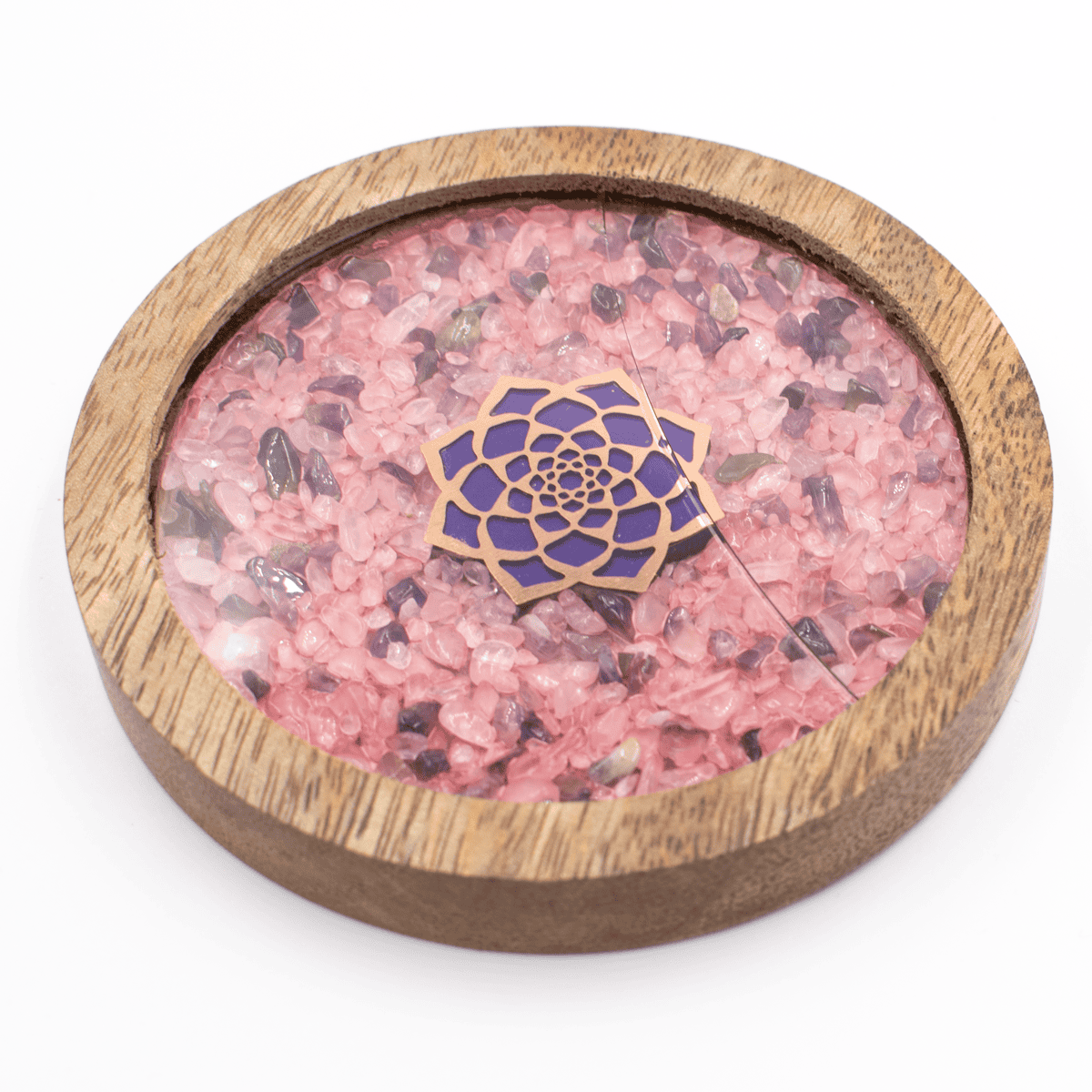 Přidejte ke svému nápoji nádech mystiky pomocí podtácků s minerály. Podtácek připomíná orgonit, má dřevěný vnější okraj, zatímco střed je vyroben z minerálů a zdobené, vodivé kovové části zalité polyesterovou pryskyřicí.