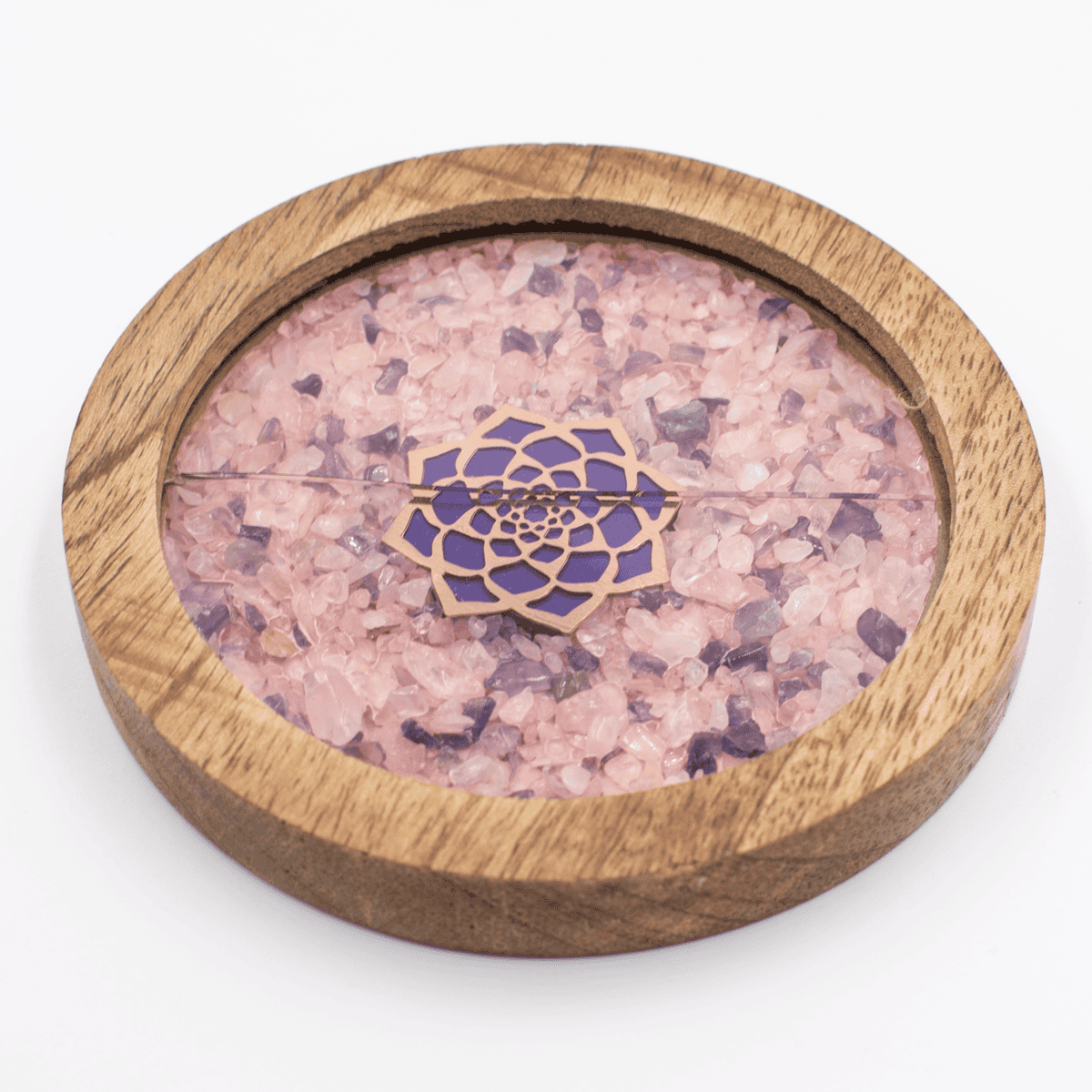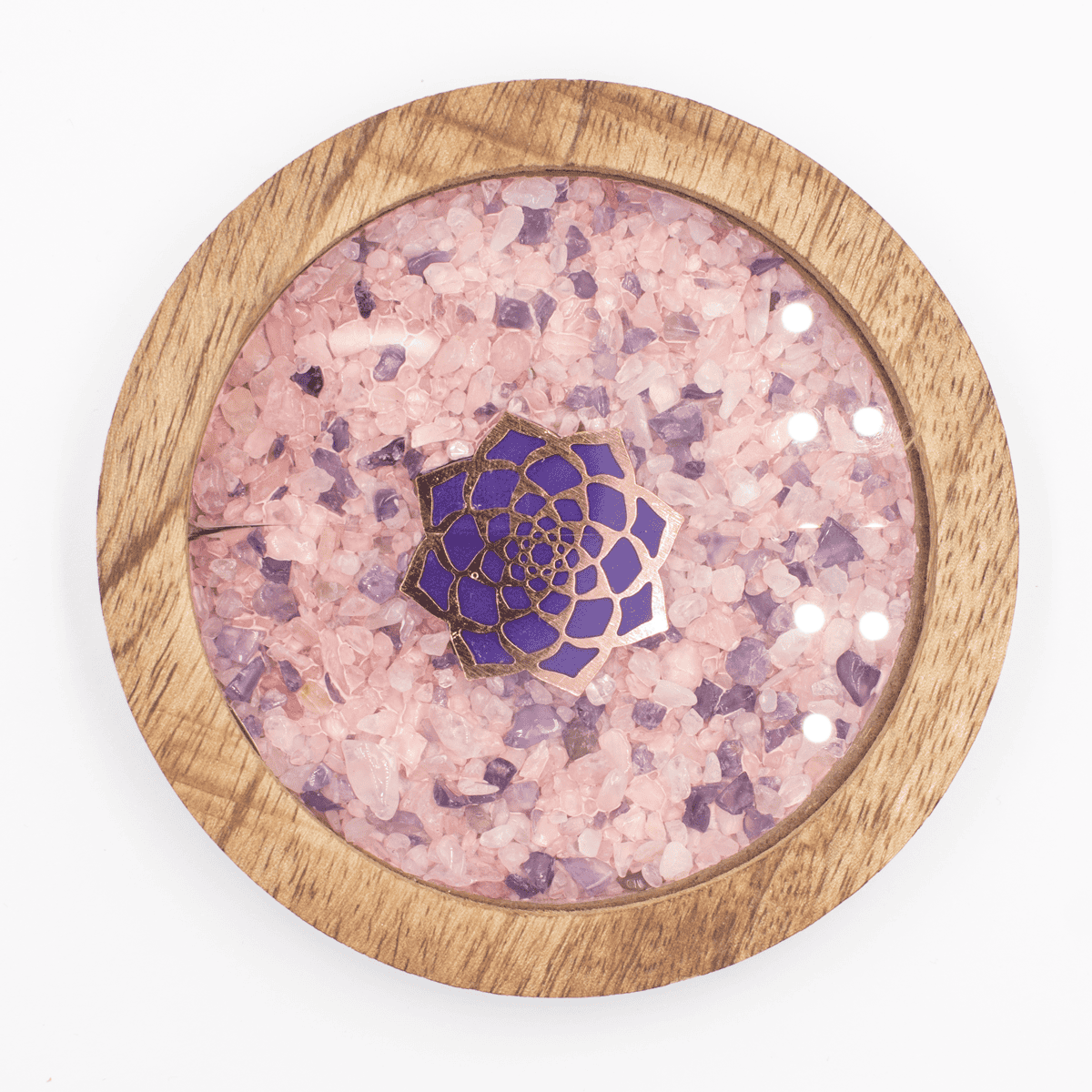 Přidejte ke svému nápoji nádech mystiky pomocí podtácků s minerály. Podtácek připomíná orgonit, má dřevěný vnější okraj, zatímco střed je vyroben z minerálů a zdobené, vodivé kovové části zalité polyesterovou pryskyřicí.