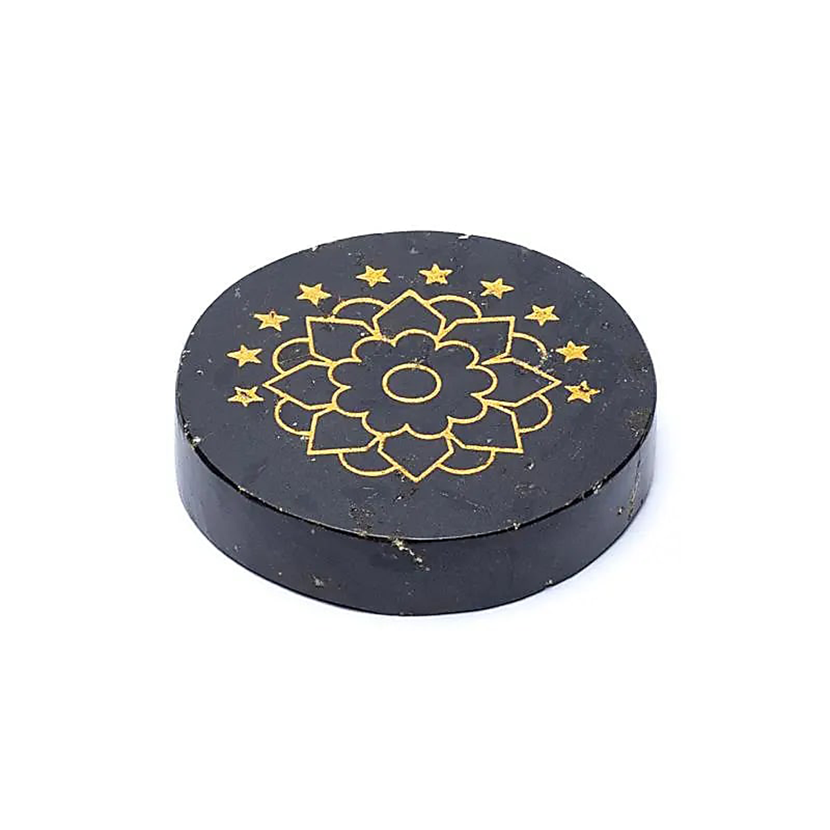 Turmalínový disk se symbolem lotosu, vhodný například k umístění na oltář nebo k nošení jako talisman.
