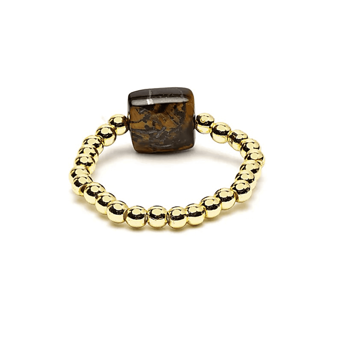 Elastický prsten s fazetovaným tygřím okem a zlatými kovovými korálky. Malý a elegantní šperk, který je vhodný jako doplněk ke každému outfitu. Díky elastickému pásku prsten padne na většinu velikostí prstů.