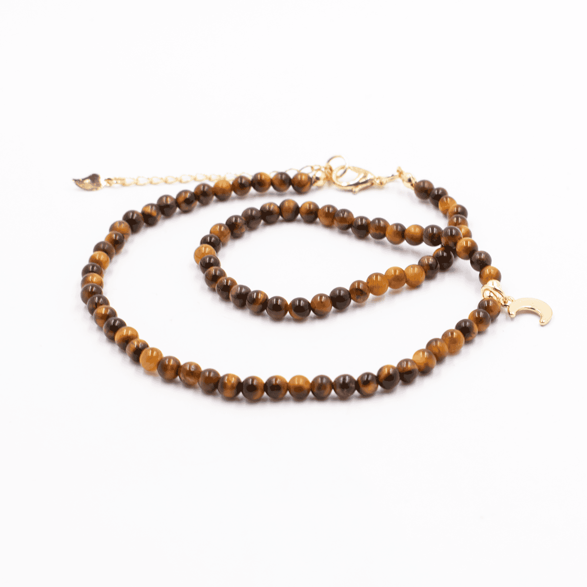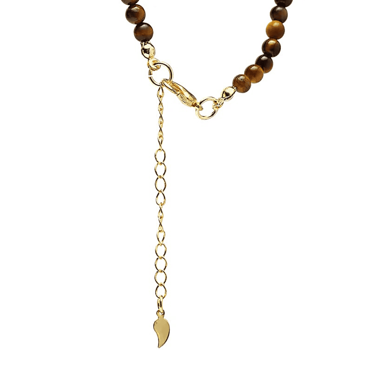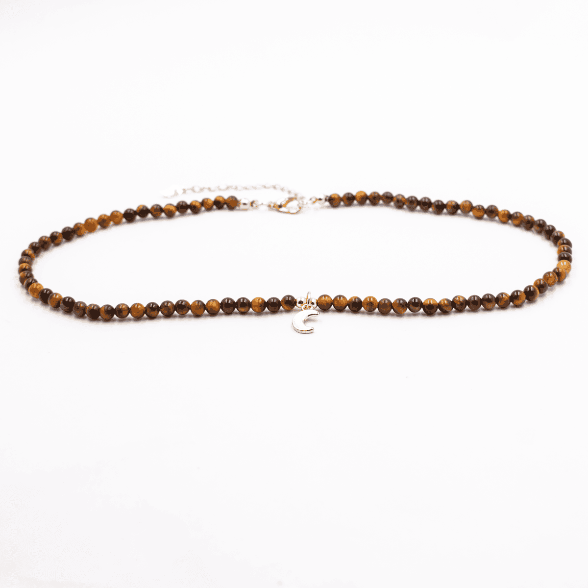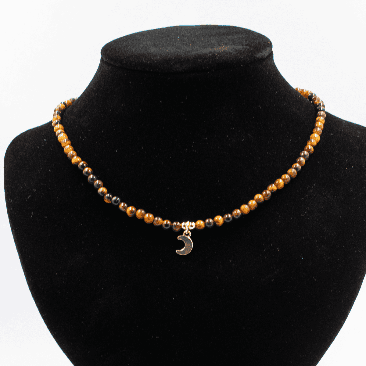 Jemný náhrdelník z kombinuje leštěné korálky z tygřího oka o velikosti 3 mm se zlatým přívěskem ve tvaru měsíce, který představuje intuici, emocionální rovnováhu a ženskou energii. Náhrdelník je nastavitelný pomocí prodlužovacího řetízku ±5 cm.